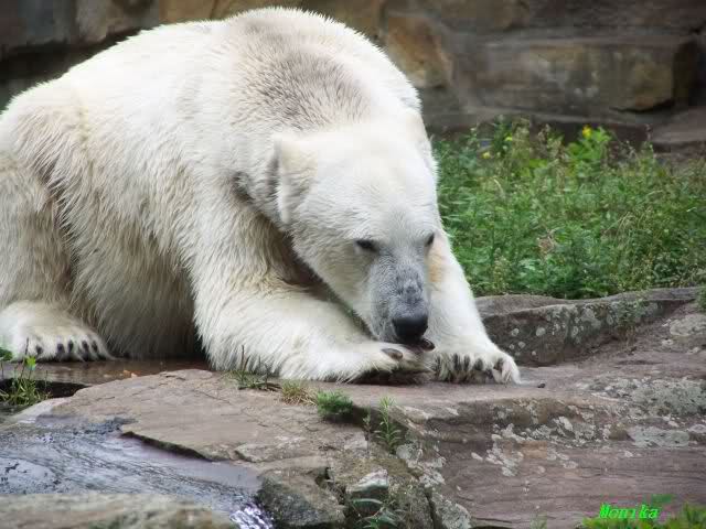 Natürlich gab es wieder Knutrufe aber der Gipfel war ein Ehepaar mit Kindern!! die mit einem Ring auf den Zaun klopften. Natürlich schreckte Knut völlig verschlafen auf. Er wollte dann in seiner Höhle weiter schlafen, was nicht ging, weil die Tür zu war. Also legte er sich vor die Höhle und versuchte weiter zu schlafen. Mir wurde heute gesagt, daß Knut wegen einer Wurmkur auf Diät ist. Ich weiß nicht wie es ihm heute geht. Ich bin gegen Mittag gegangen.