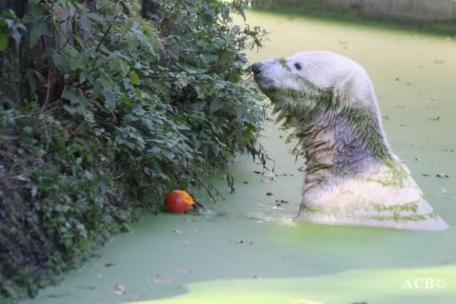Knut soll heute Vormittag im Wasser gewesen sein, mit Gianna und Ball. Der Ball wurde von Gianna am Höhleneingang abgelegt, da lag er am Mittag auch noch. Obwohl Gianna öfters zum Höhleneingang ging, nahm sie den Ball nicht mit.