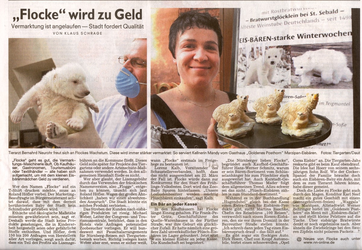 Nähere Informationen unter Eine Arbeitsgruppe im Geschäftsbereich des für den Tiergarten zuständigen Bürgermeisters Horst Förther wird so schnell wie möglich alle vorliegenden Anfragen in Sachen Merchandising rund um „Eisbär Flocke“ abarbeiten. Aktuell liegen rund 200 konkrete Anfragen aus verschiedenen Bereichen – unter anderem Spielwaren, Kleidung und Medien – vor. Die Stadt wird sukzessive mit den potenziellen Interessenten Kontakt aufnehmen. Details können im Einzelfall erst dann geregelt werden, wenn die wichtigsten markenrechtlichen Fragen geklärt sind. Die Stadt hat die Marken „Flocke“ und „Eisbär Flocke“ beim Patent- und Markenamt angemeldet. Die Stadt Nürnberg geht davon aus, dass eine Entscheidung des Patent- und Markenamts aufgrund der dortigen Arbeitsabläufe voraussichtlich in etwa zwei Wochen ergeht.