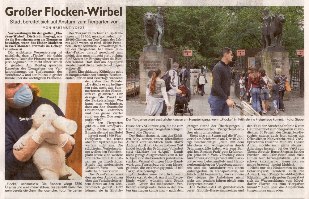 Seit es Flocke gibt, steht täglich ein Artikel über sie in unserer Zeitung. Bei Knut war das nicht so. Da habe ich im März 2007 ca. 3 x ein Foto von ihm gesehen und einen kleinen Artikel.