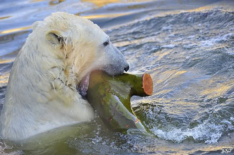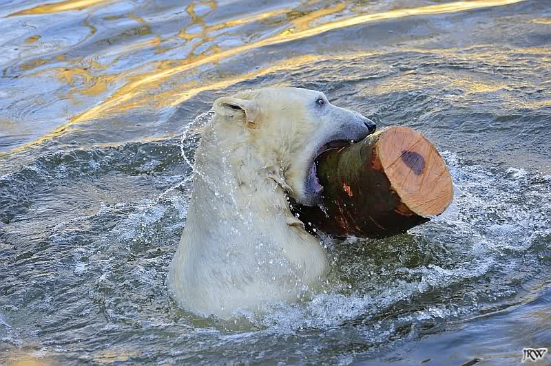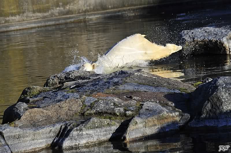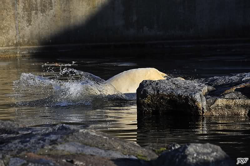 Dem sehr ruhigen Tag bei den Eisbären folgte ein furioses Spiel im Wasser. Knut wartete bis die Großen drinnen waren und ging dann sehr bedächtig über die Anlage. Er schnüffelte jeden Platz ab, an denen die Mädels gelegen hatten. Dann überlegte er kurz und ging nach einigem Zögern ins Wasser. Er spielte Eisbrecher auf der linken Seite des Geheges, jagte die Enten, sprang lebensfroh ins Wasser. Er kletterte auf die Insel und sprang von dort, schwamm auf die andere Seite und holte sich Beschäftigungsmaterial. Von der Baumfällaktion hat er einen schönen Baumstamm, fand ein Stück Fell im Graben, das ihn kurz interessierte, spielte kurz mit seinem T-Shirt und tobte wie ein Wilder durch das Wasser. Hin und wieder zeigte er sich mit seinen Dingen an der Scheibe und die Besucher (viele von auswärts) waren hell begeistert.