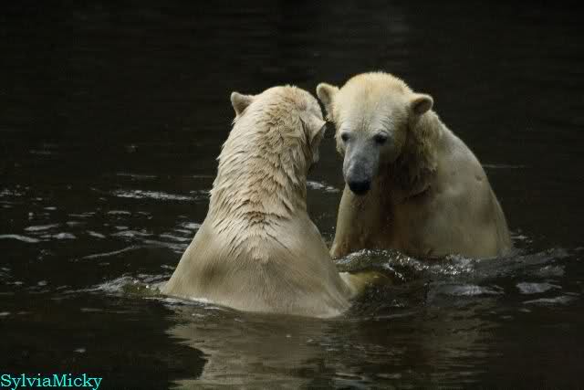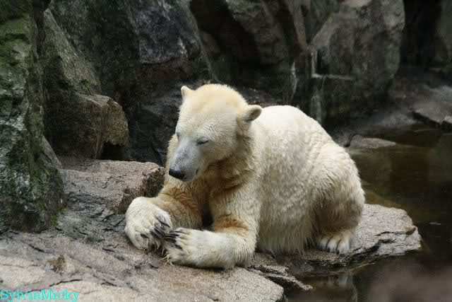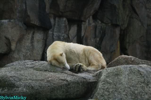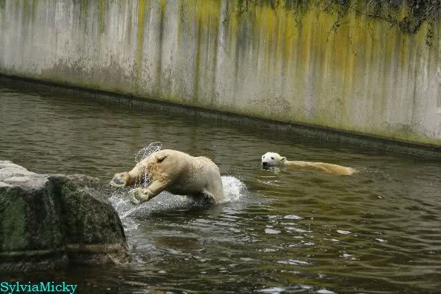 Wunderschöne Bilder, liebe Sylvia, Danke dafür! Es ist immer wieder schön, das man mit so tollen Bildern und Berichten versorgt wird, wenn man selbst nicht in den Zoo kann. Ja, ja, diese Harmonie ist einzig artig. Da hast Du ja mal wieder großes Glück gehabt, Knut und Tosca im Wasser. Gestern, weißt Du noch? Ach, wenn ich daran denke, schlägt mein Herz wieder ganz schön heftig. Diese kleine Dampfwalze, so was von hinterlistig! Schön, das Du gestern noch einmal nach unserm Knut geschaut hast. Als ich noch einmal nach ihm schaute, lag er immer noch in der hintersten Ecke und wusste nicht, wie er sich hinlegen sollte, und wohin mit seinem Kopf, echt traurig. Hätte ich 3 Wünsche frei, würde ich mir für unsere Eisbärchen wünschen "Schöne, weiche Liegemulden" "Eisbär-Beschäftigung" (da gibt es doch diese wunderschönen Kugeln, ein so genanntes Aussidog usw. usw.) und "Baumstämme" zum schubbern und Krallen wetzen!!! Sind das wirklich so außer gewöhnliche Wünsche??? Meinst Du, wenn man möchte, könnte man sie erfüllen? Das wäre schön!!! KNUTE NACHT_KNUT WELT