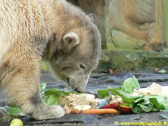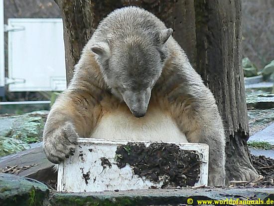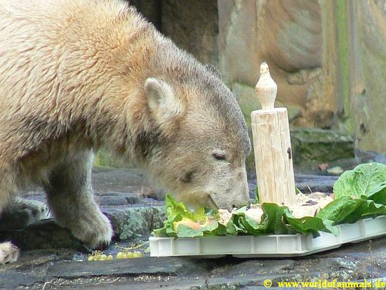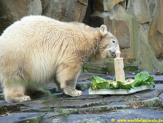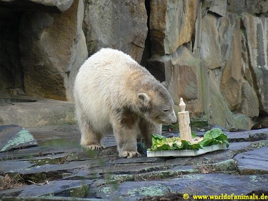 Danach durfte Knut wieder auf die Anlage und machte sich sofort über die Torte her. / At 11 am must Knut leave the enclosure. Thomas Dörflein and Ronny Henkel brought the special cake for Knut. Fisch, apple, rice, salad and more in the cake. And a wooden candle in the middle of the cake. Than Knut came on the enclosure and he was happy about the cake...
