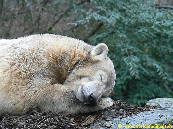 Ich denke er träumt von der Riesentorte aus Marzipan der Berliner Bäcker Innung. 700 Euro brachte der Verkauf für den Förderverein Zoo/Tierpark ein. 2 x 3 Meter war die Torte groß, alleine 400 Eier wurden verbraucht.../ I think he is dreaming about the very big marzipan cake from the Berlin Bakers, with 400 eggs etc. A gift for Knut. Sold to the visitors today.