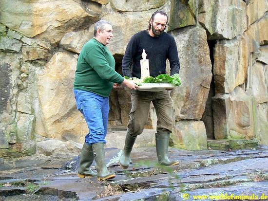 Um 11 Uhr musste Knut die Anlage verlassen und Thomas Dörflein brachte zusammen mit Ronny Henkel eine Spezialtorte für Knut herein. Fisch, Reis, Äpfel, Weintrauben und Salat waren drin. In der Mitte eine Kerze aus Holz, mit der Knut spielen darf.