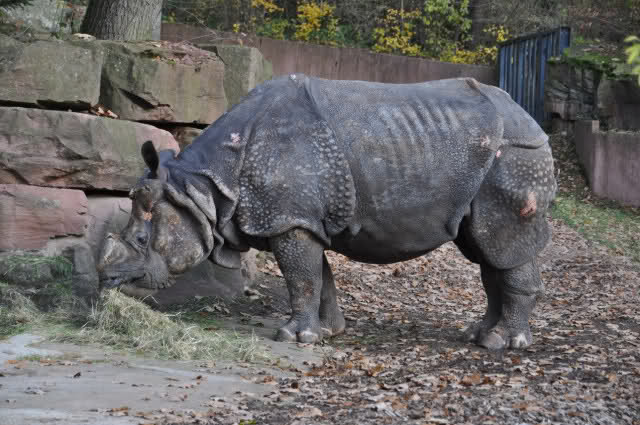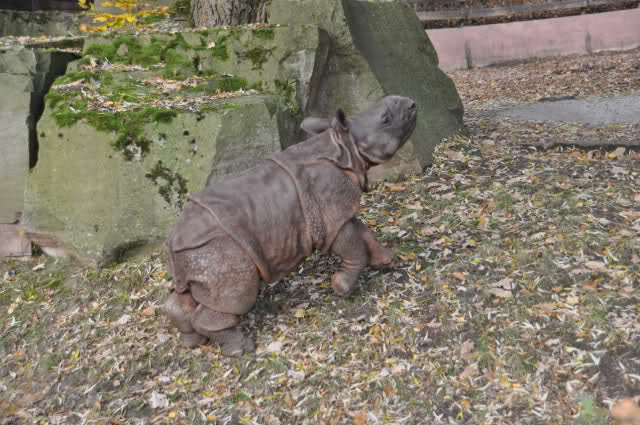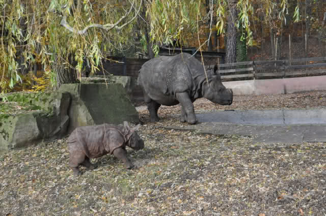 Auf dem Weg zu Ausgang schauten wir noch einmal zum Nashörnchen. Das war schon im Haus, allerdings in einem Gatter, wo man es sehen konnte. Mutter Nashorn futterte und das Kleine ging an die Milchbar.