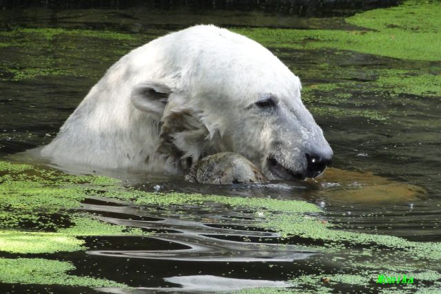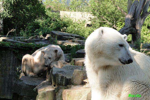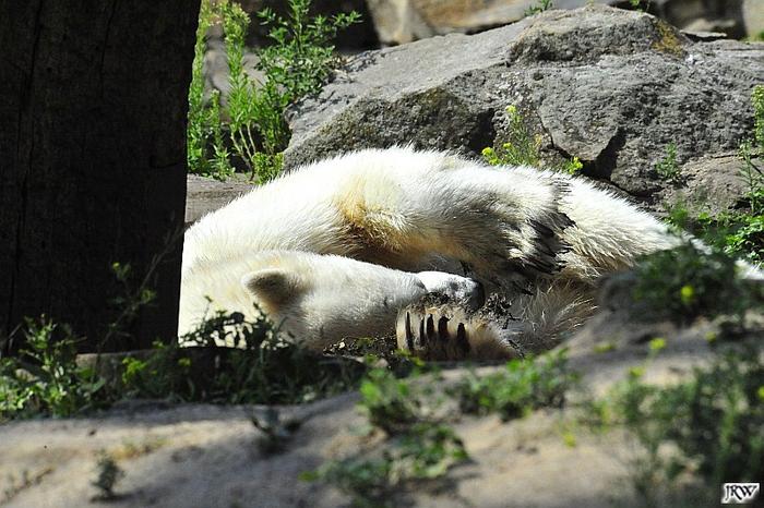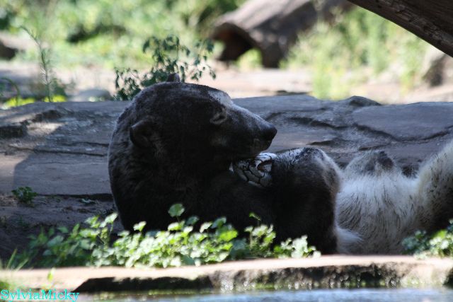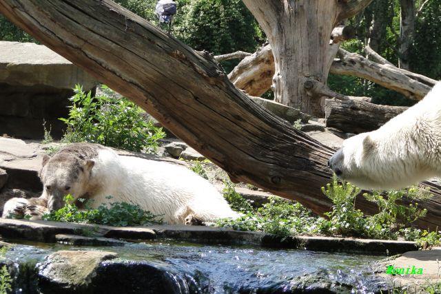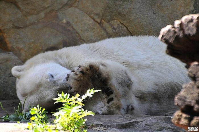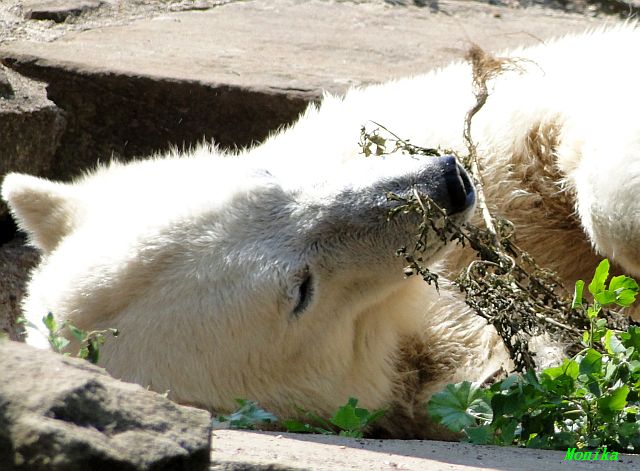 Der Möhrchennotstand schien heute beendet zu sein. Sehr zur Freude beider Bären warf MR netterweise wieder Möhrchen auf die Anlage. Somit gab es keinen Streit zwischen den Beiden. Gianna suchte alles ab um seine Möhren und Äpfel zu finden und Knut fraß derweil ihre Möhren. Danach färbte sich Gianna ein und ein sauberer Knut spielte sich eine Weile in den Schlaf.