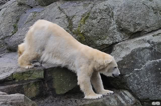 Katjuscha hatte eine fantastische Zeit: Sie spielte "Jagd auf Knut". Sie stand wie angewurzelt oben und beobachtete Knut. Dabei schloss sie auch, wie üblich, hin und wieder die Augen. Einen solchen Moment nutzte Knut voll aus und schlich auf die Anlage. Erst schaute er nach Tosca, die ihre Schritte jedoch nicht unterbrach, dann bummelte er ein wenig weiter. Inzwischen war Kati aufgewacht, kam um den Felsen, sah Knut, gab Gas und raste auf ihn zu. Er lief hinter den letzten großen Felsen und stellte sich ihr brüllend entgegen. Sie machte einen kurzen Rückzug und Knut meinte das Theater sei vorbei. Weit gefehlt! Während er weiter schlenderte, drehte sie den Turbo auf und raste auf ihn zu. Er flitzte diesmal weg und Kati flog geradezu über die Felsen und folgte ihm. Also musste Knut von seinem unteren Stein wieder auf die Anlage klettern, Kati machte kehrt und traf ihn oben und die Verfolgungjagd begann auf's Neue. Als Knut wieder nach unten geflüchtet war, kam sie den Steilfelsen hinuntergesaust (das hatte ich vorher noch nie gesehen). Das war Knut dann doch zuviel und er brüllte sie an. Daraufhin lief sie zu seinem Plateau und zeigte ihm, wie schön es dort ist. Da er nicht folgte, ging sie nach oben und bezog ihren Beobachtungsposten. Knut blieb auf dem unteren Stein liegen, sie legte sich hin, immer Knut im Sichtwinkel und leckte sich die Tatzen. Sie sah sehr zufrieden mit sich und der Welt aus.