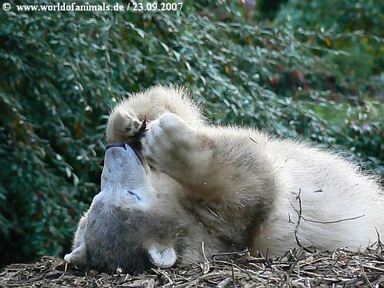 Es ist der Rbb Zoo Tag am 23. September 2007. Knut wurde kurz nach 09:30 h von Thomas Dörflein mit einem Croissant auf die Anlage gebracht. Dann war Knut alleine. Zwei Stunden tobte er herum, war fast eine Stunde im Wasser, spielte über eine Stunde mit dem Sack, in dem ein Ball steckt. Pünktlich zur ersten Live Übertragung des Rbb schlief Knut ein .