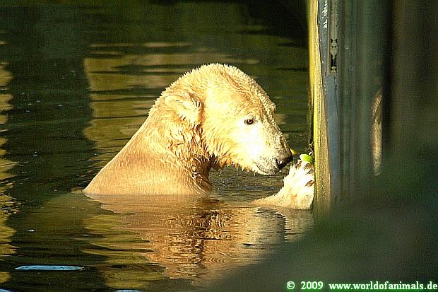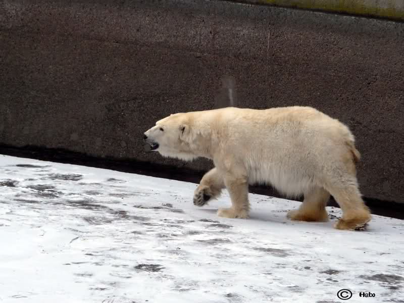 Knut lief sehr hungrig hin und her, kein Wunder, vor seinem Gehege stand ein Mann mit einer Lachsforelle in der Tasche, die bekommt er jeden Mittwoch von ihm.