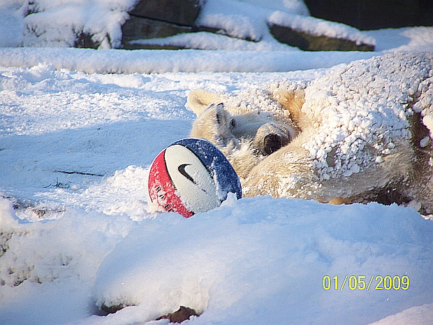 Jedenfalls sah ich mir die Fütterung bis zum Schluss an. Sonst legen sich die Eisbären die Nüsse immer auf den Tatzen. Aber weil noch kein Wasser in ihrem Becken ist, mussten die Herrschaften die Nüsse einfach vom Eis aufschlecken. Das tat dem Appetit keinen Abbruch.
