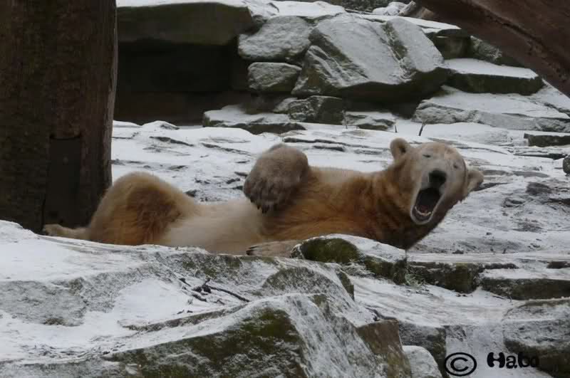 Ich ging dann weiter zu den großen Eisbären. So wie beim letzten Mal lagen die Damen oben auf dem großen Felsen. Lars hingegen lag unten auf dem Eis. Dort, wo er immer liegt, ist das Eis schon richtig blank poliert.