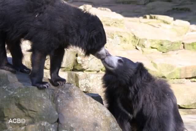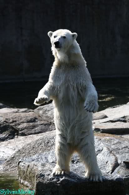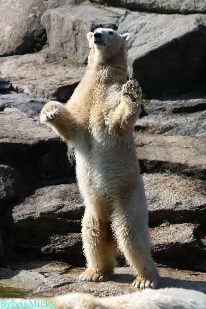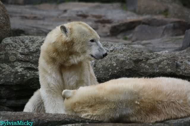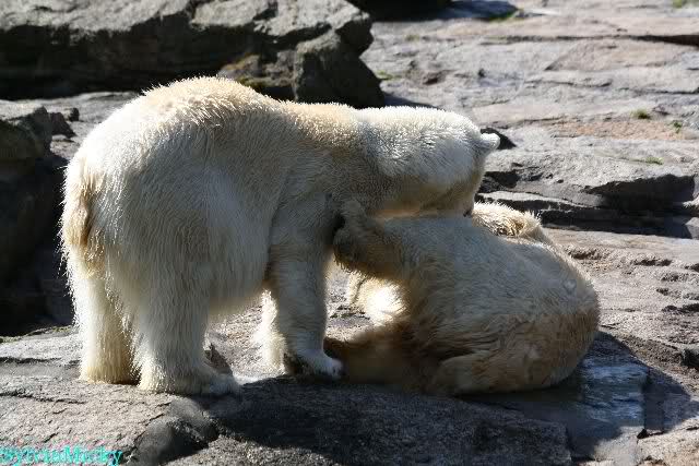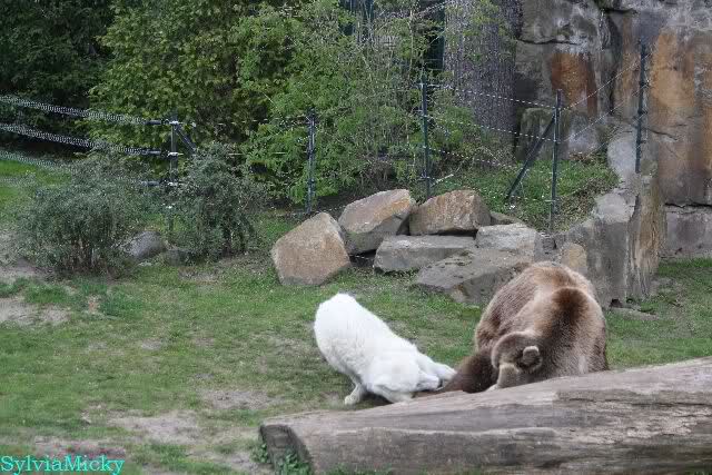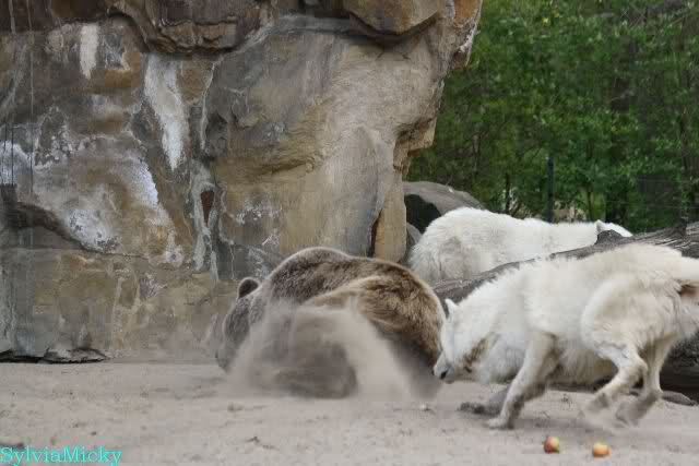 Petzi und Siddy mußten sich bei der Fütterung ganz schön heftig gegen die Wölfe wehren. Ich denke, der Biß eines Wolfes ist bestimmt schmerzhaft für die Bären aber die Pranke eines Bären könnte eventuell tödlich sein für die Wölfe.