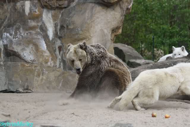 Der Inhalt der Fotos auf denen sich der Wolf auf den Bären stürzt, als der in die Knie geht, gefällt mir garnicht. Es ist ja wohl nicht die erste Attacke.