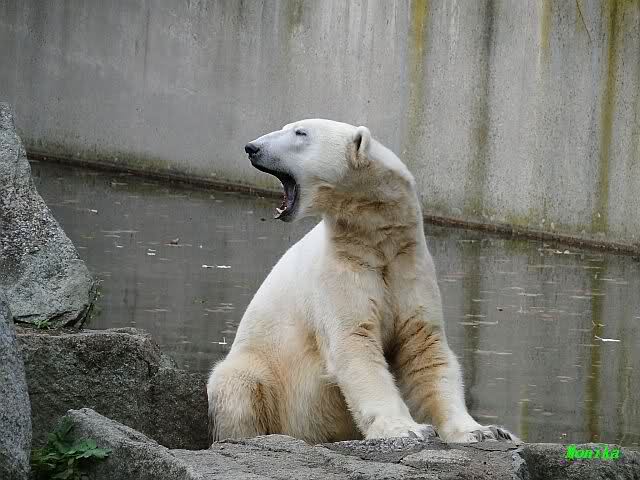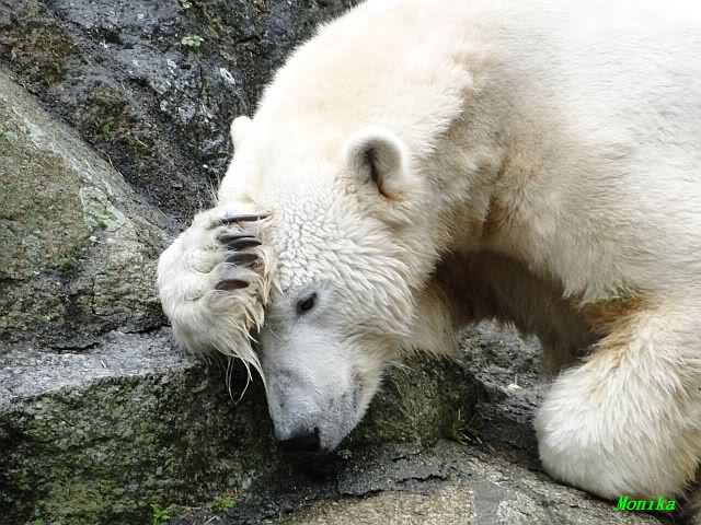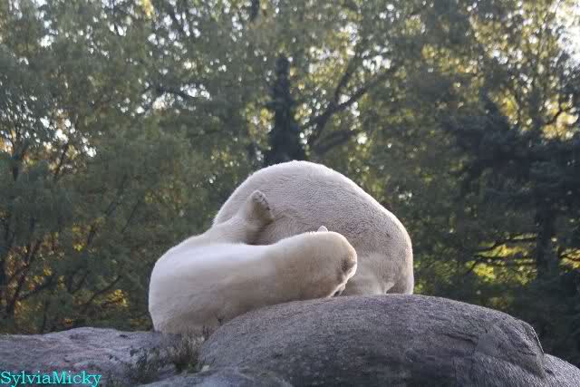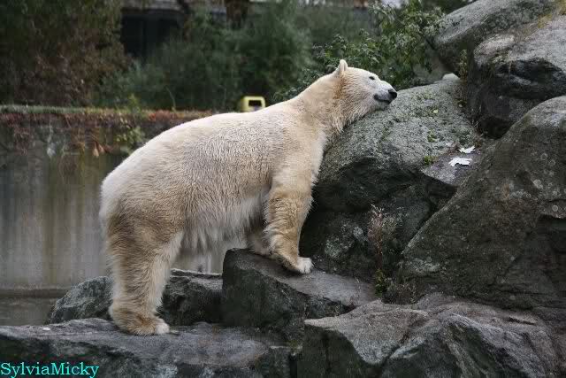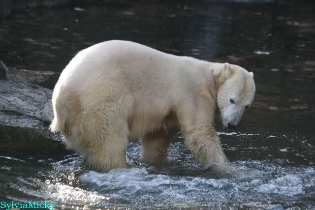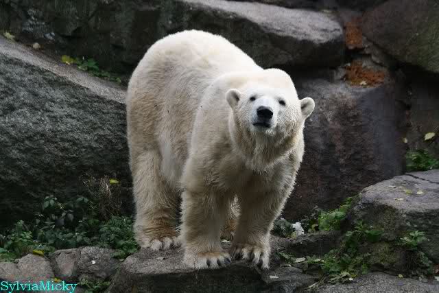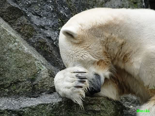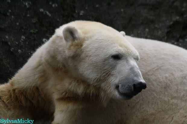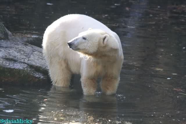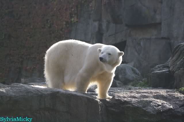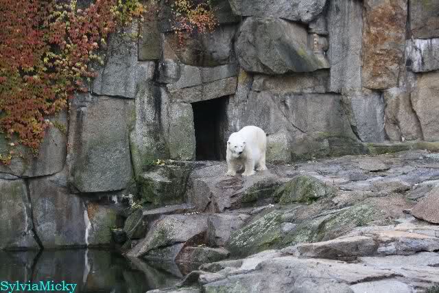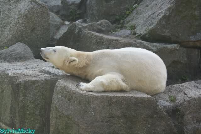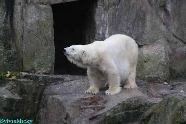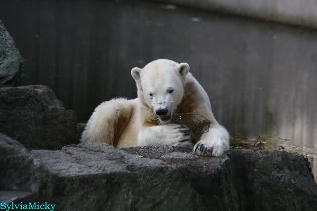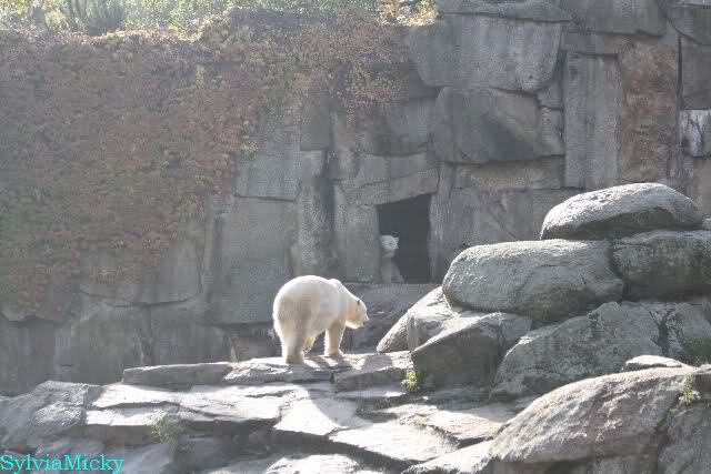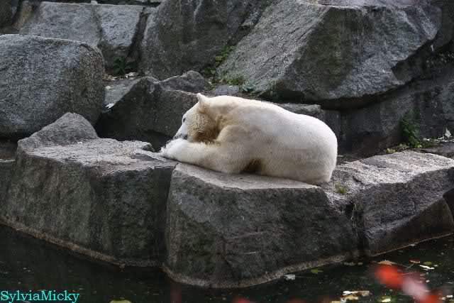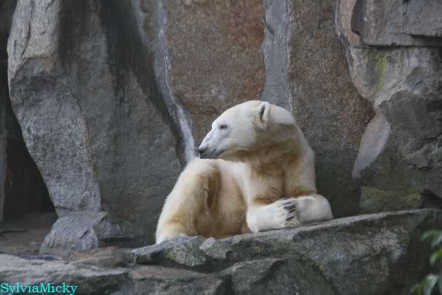 Good evening to you all Knut & Co. friends around the world at the end of Sunday here. Bad weather at afternoon. It was a short visit in Zoo for me. Polar bears in rain. No probs between the bears. Knut was sitting on his little place at the right side of the enclosure, looking what the bears were doing. Tosca and Kati were walking. And Nancy was sleeping behind the rocks.