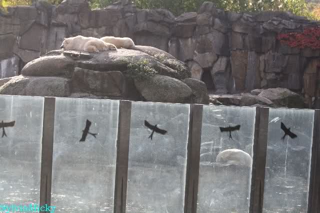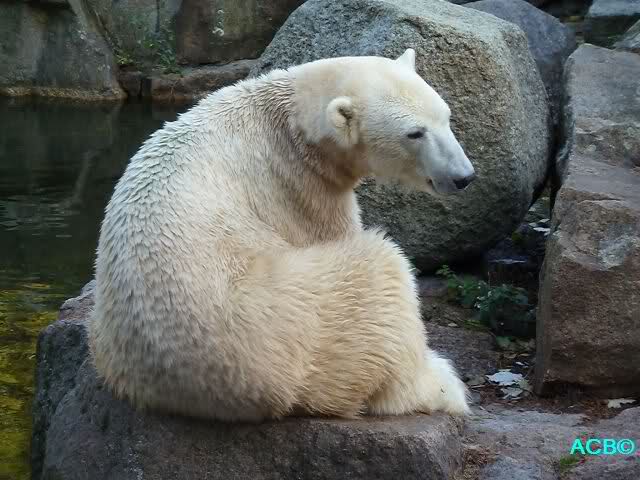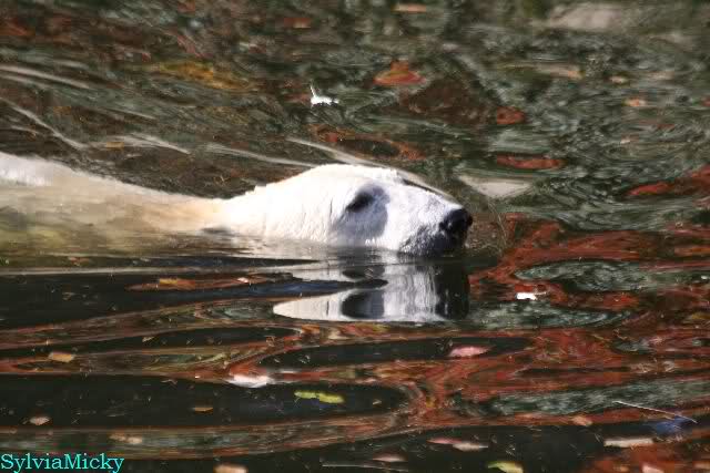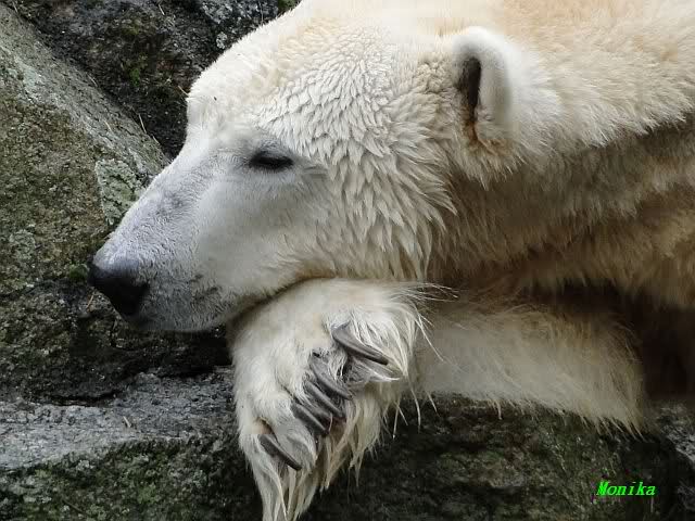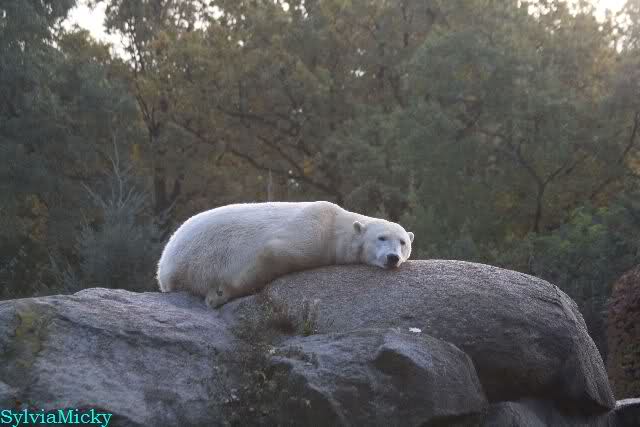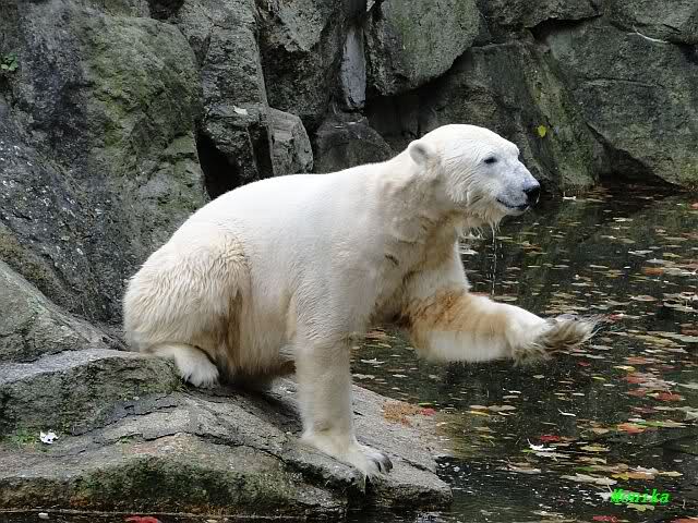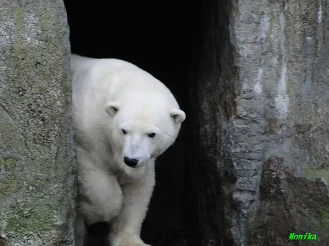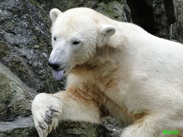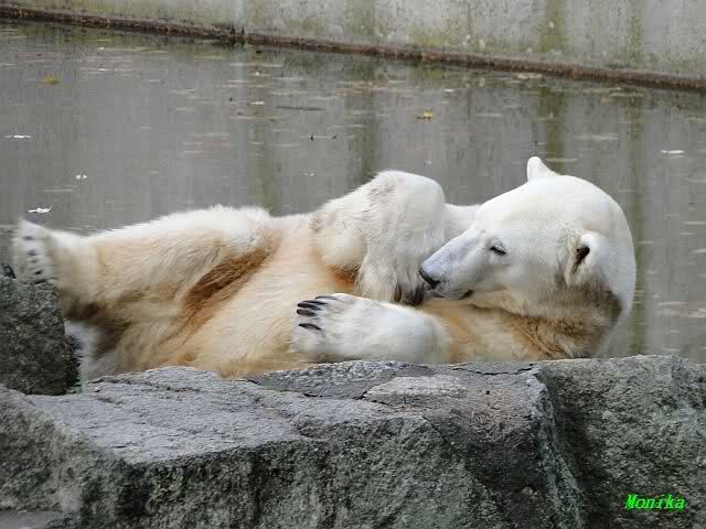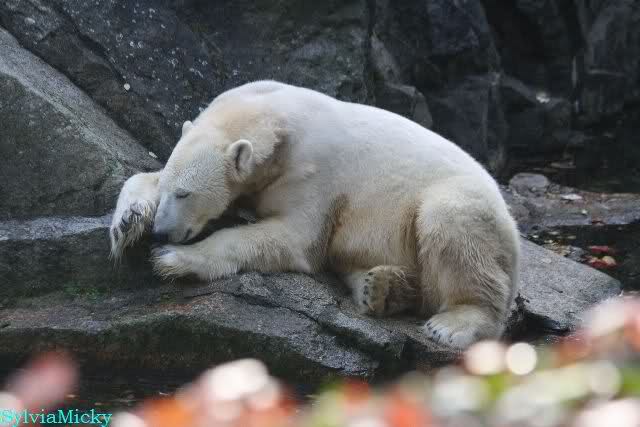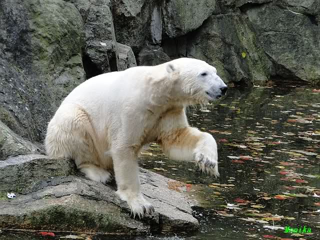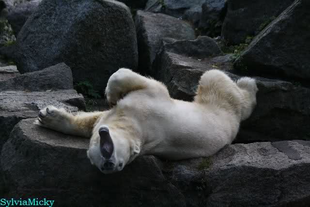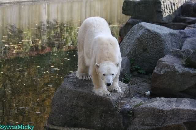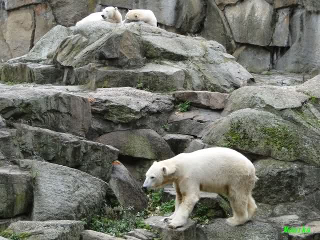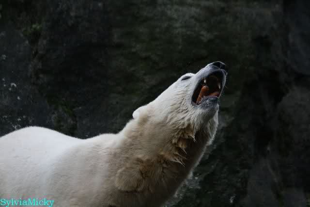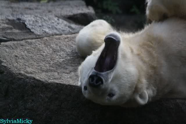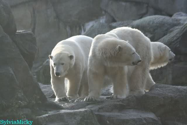 Good evening to you all Knut & Co. friends around the world at the end of Sunday here. Bad weather at afternoon. It was a short visit in Zoo for me. Polar bears in rain. No probs between the bears. Knut was sitting on his little place at the right side of the enclosure, looking what the bears were doing. Tosca and Kati were walking. And Nancy was sleeping behind the rocks.