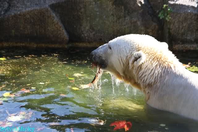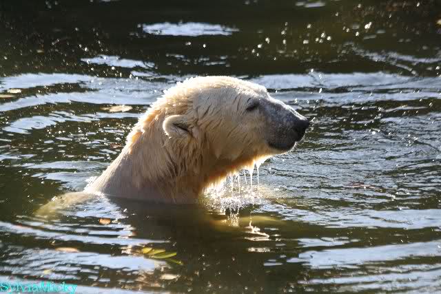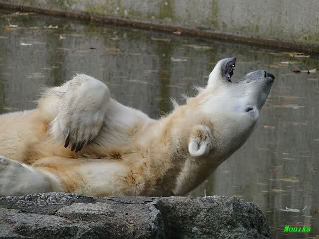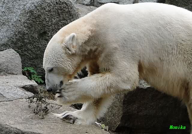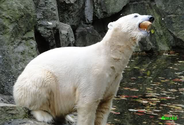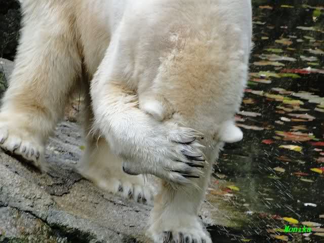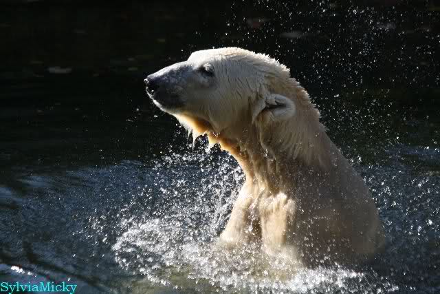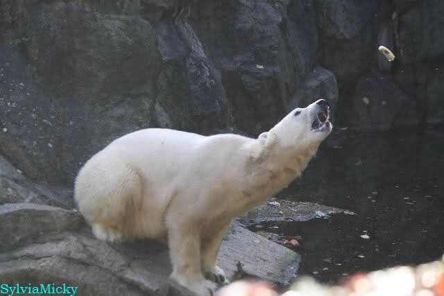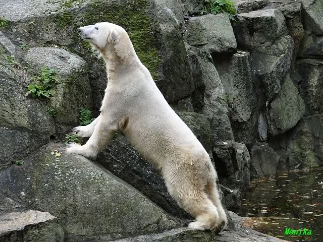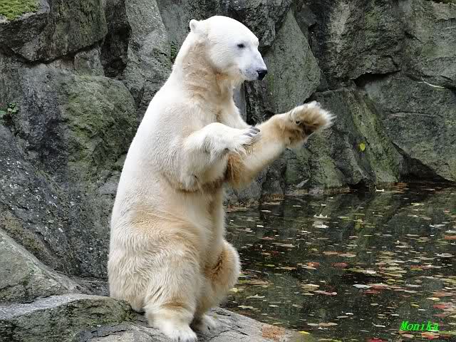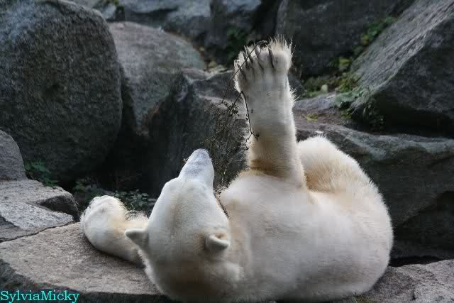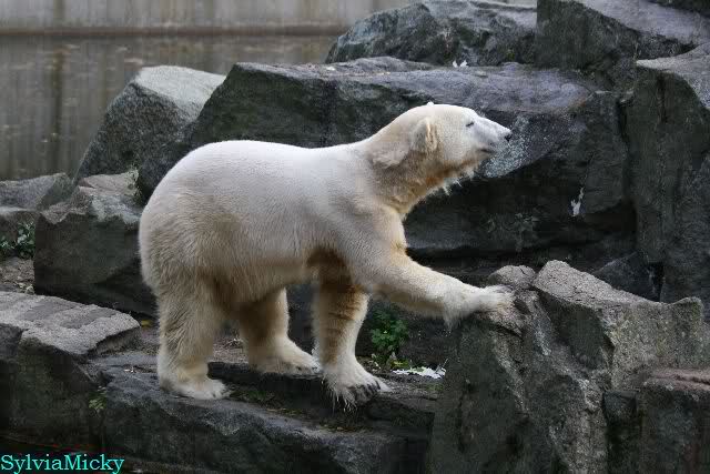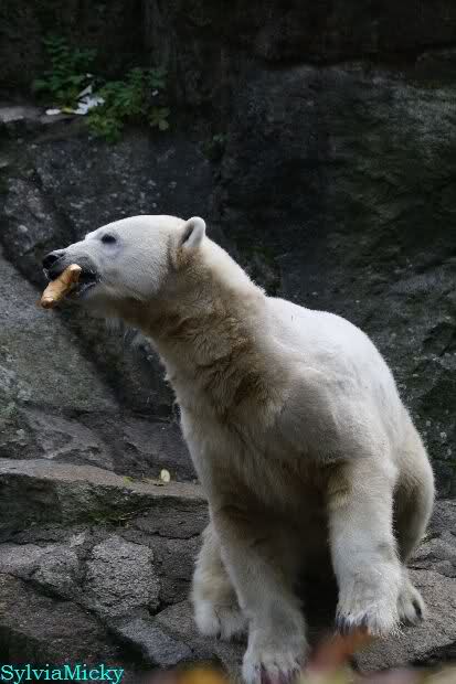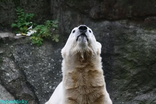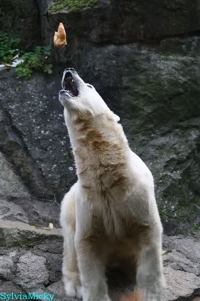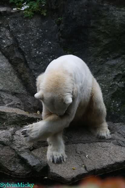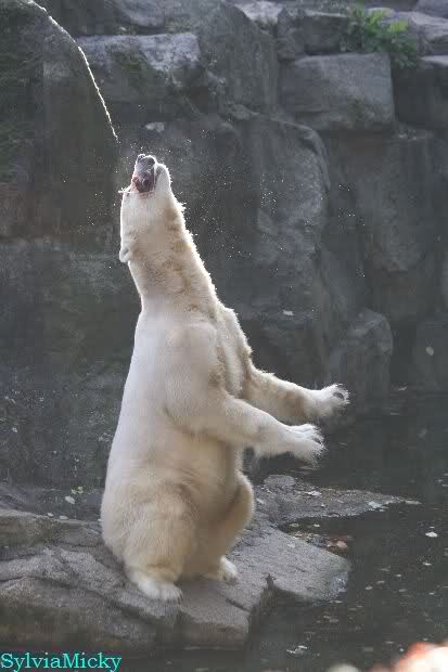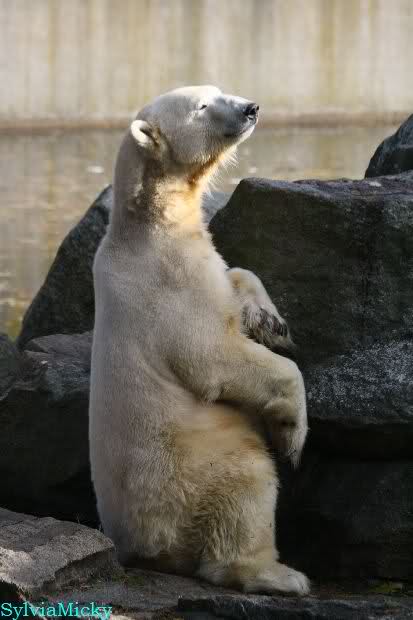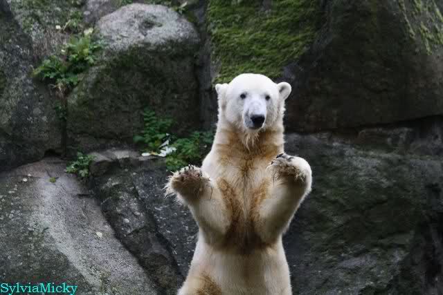 Nur mal so nebenbei: Es wird ja von Kritikern bemängelt, das Knut zu vermenschlicht ist und er stehend um Futter bettelt, bzw. danach winkt. Dieses Foto entstand 2007 bei den großen Eisbären im Berliner Zoo...