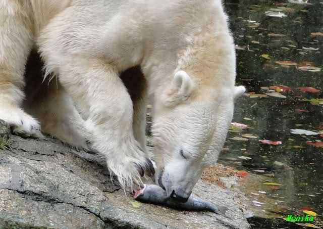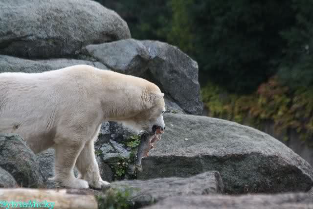 Auch die Großen bekamen Lachs. Nancy kam zu Knut während seiner Fütterung runter gelaufen. Blieb aber entfernt von ihm stehen. Knut ließ sich aber nicht stören und fraß in Ruhe seinen Lachs zu Ende.