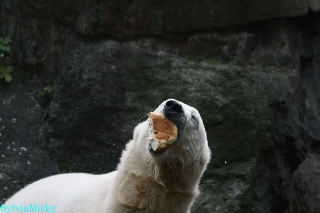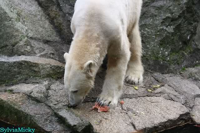 Knut bekam heute reichlich zu essen. Ein Croissant, Fische, mehrere Stücke Fleisch, ein halbes Rosinenbrot und einen schönen großen Lachs.