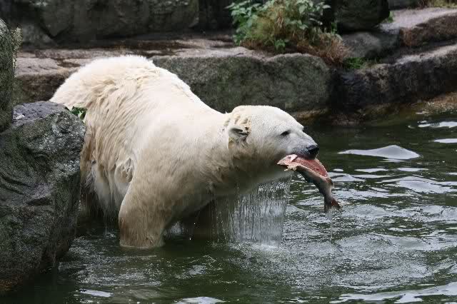 Heute Morgen bekamen die Eisbären auch wieder Lachs. Diesmal bekam auch Nancy einen. Es fütterte ein junger Pfleger, der seine Sache sehr gut macht.