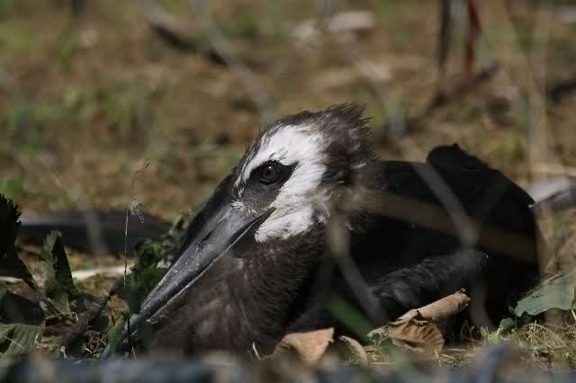 Der kleine Storch. Die Mutter legte Blätter um ihn herum. Mir kam es vor, als wenn sie ein Nest bauen würde. Das alte Nest hat, nach Aussagen eines Pflegers, ein Andenkondor zerstört.