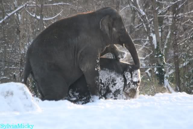 Während die Innenkäfige sauber gemacht wurden, hatten die asiatischen Elefanten Ausgang im Schneegestöber