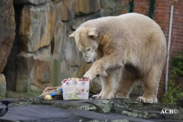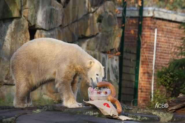 Knut bekam heute von seinen Pflegern eine Eistorte und von einer Knutfreundin einen, mit Leckerchen und einem Quietschspielzeug, gefüllten Jutesack.