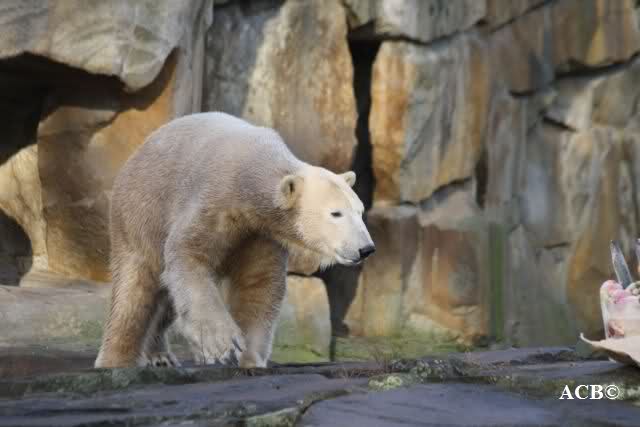 Um 11.00 Uhr wurde Knuts Geburtstagstisch gedeckt. Er bekam eine liebevoll dekorierte Eistorte, ein großes Brot als 3 geformt, einen großen Lachs und einen Jutesack. Gianna wurde für eine Stunde eingesperrt. Man hörte sie von draußen lautstark an die Tüe bummern. Sie wollte raus. Knut hatte 1 Stunde Zeit, um die Leckereien zu verspeisen. Als erstes fraß er das Brot und den Lachs. Dann ging es an die Eistorte. Nur die Eistorte braucht länger als 1 Stunde um aufzutauen. Gianna kam, und stürzte sich sofort auf die Torte. Es gab eine kurze Rangelei, und Knut überließ Gianna unfreiwillig die Torte.