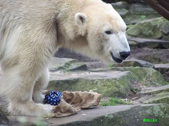 Good evening to you all Knut friends worldwide at the end of Knuts 3rd birthday. Please take a look to the pictures and watch Knut gifts. He got one hour time to eat the cake, to play with the new bag. After one hour Giovanna came out of her cave and did eat the rest of the cake, did play with Knuts new bag etc...