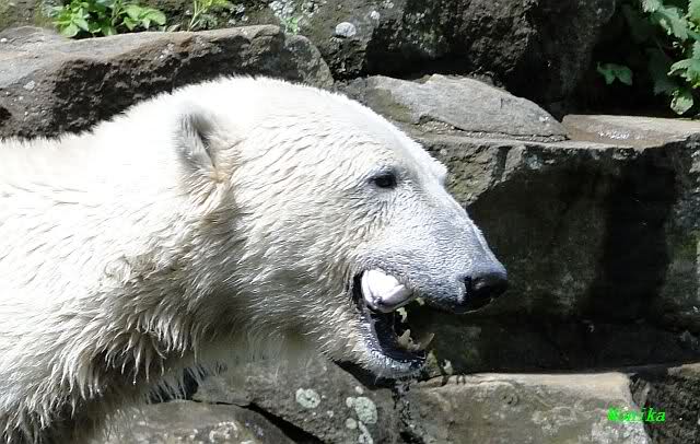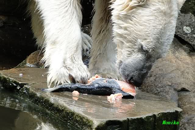 Heute bekam Knut von einer Hamburger Knutfreundin 2 große Lachsköpfe und ein großes Stück Lachs. Herr Röpke warf noch einen Lachskopf oben in den kleinen Pool. Den holte sich Knut auch noch. Das gab es auch noch nie, dass Knut den Lachskopf und den Kürbis ganz in Ruhe alleine verspeisen kann, ohne dass Gianna es ihm weg nahm.