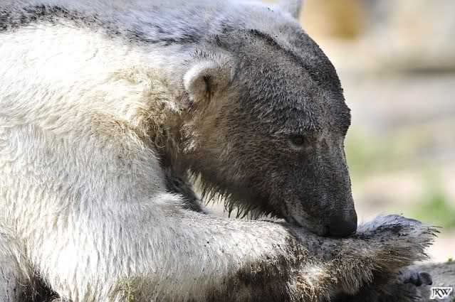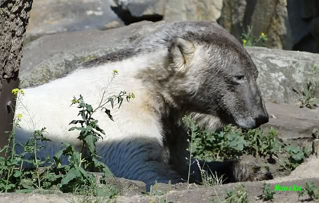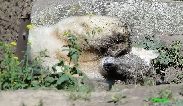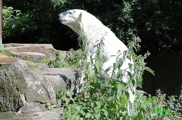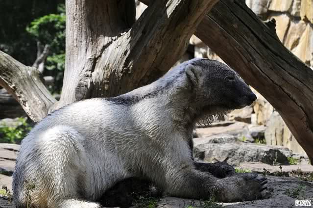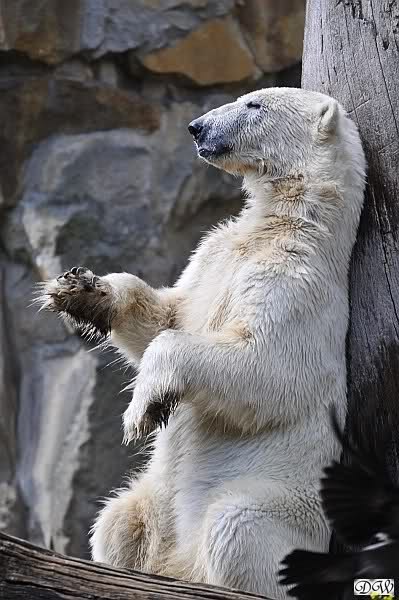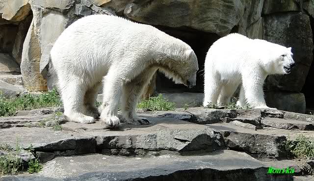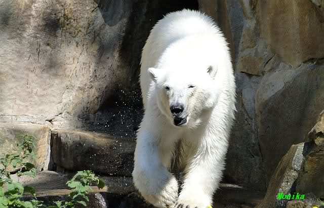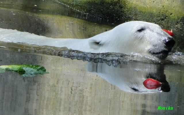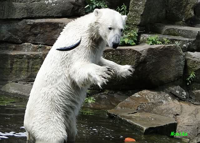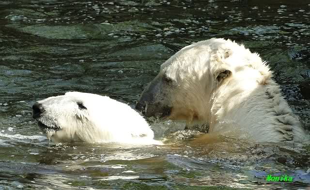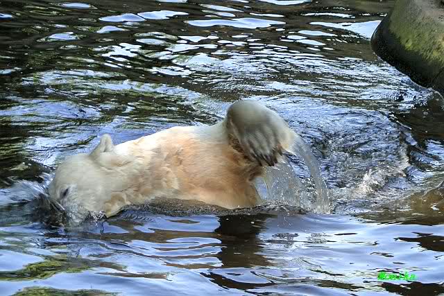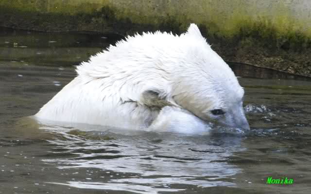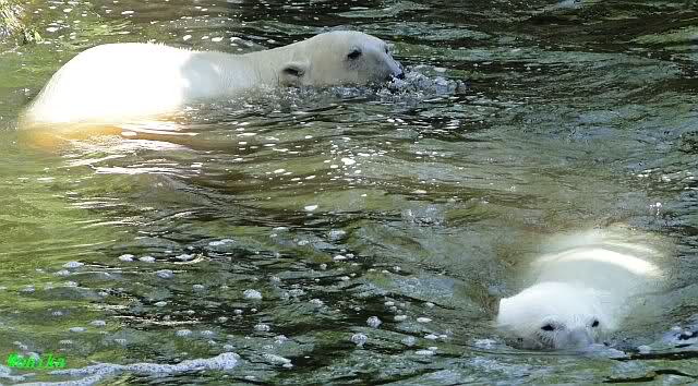 Gespielt haben heute wieder die großen Eisbären. Erst Nancy mit Tosca, dann ganz kurz alle drei und als Tosca ihren Zirkus-Gang einlegte, spielten Katjuscha und Nancy miteinander. Schön zu sehen, dass die Eisbärinnen nicht zu alt zum spielen sind. Tosca’s Ohren müssten eigentlich schon die Ohrenlänge eines Kaninchens haben. Gestern war das große Ohrenschlecken angesagt und heute halt die Spielerei im Wasser.