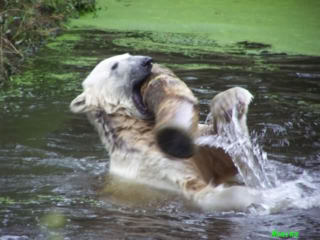 Knut ist heute so gegen 10.00 Uhr aufgestanden und spielte dann mit seinem Baumstamm im Wasser. Zum Mittagessen gab es heute neben das Übliche wieder den Mittwochs-Lachs und ein großes Weißbrot. Danach wurden wieder lange die Pfoten geleckt. Dann war schminken angesagt und anschließend ein Nachmittags-Schläfchen gehalten.
