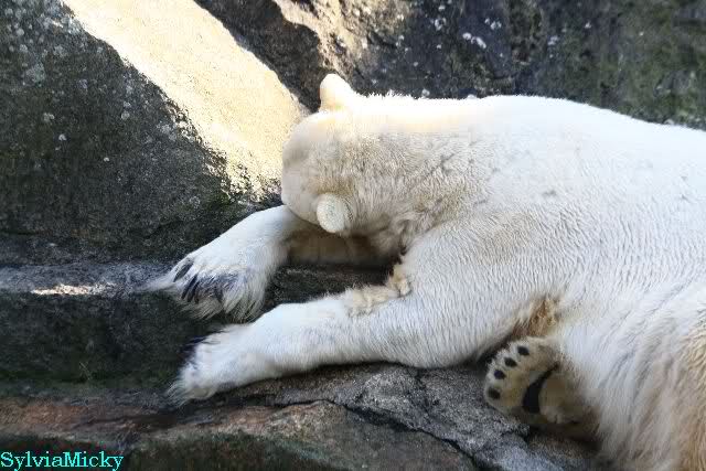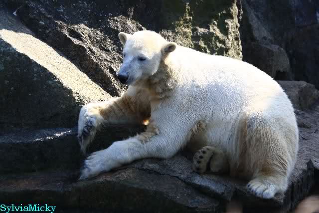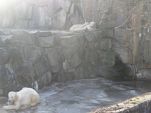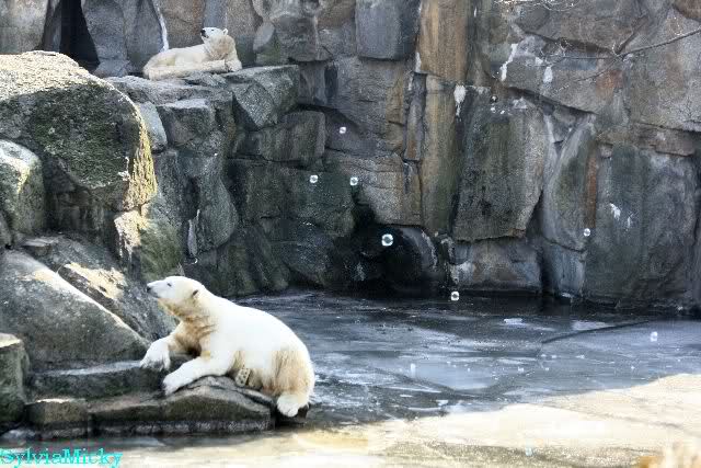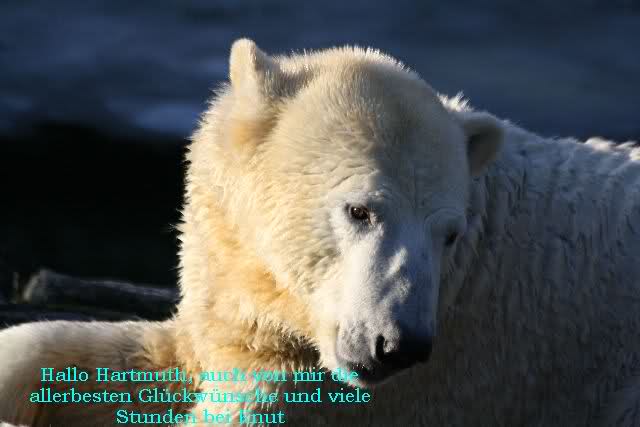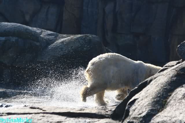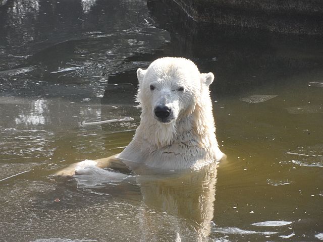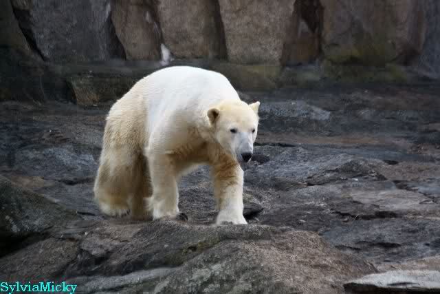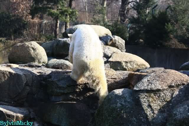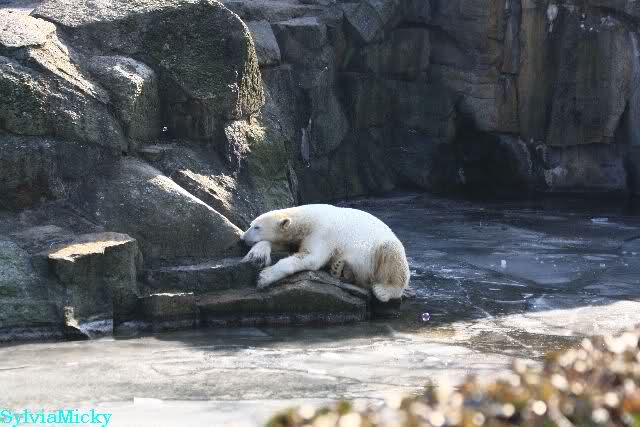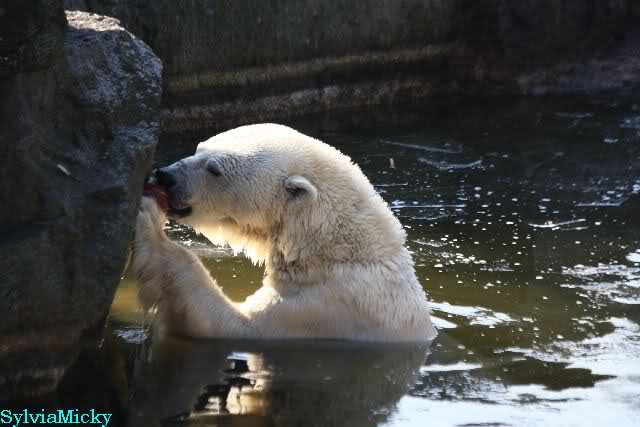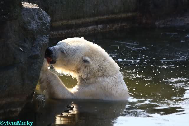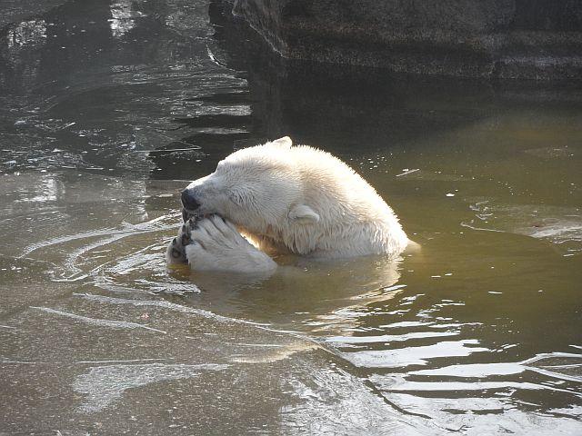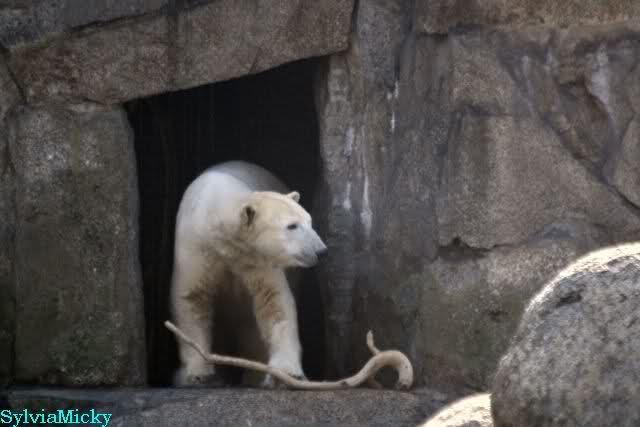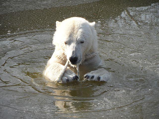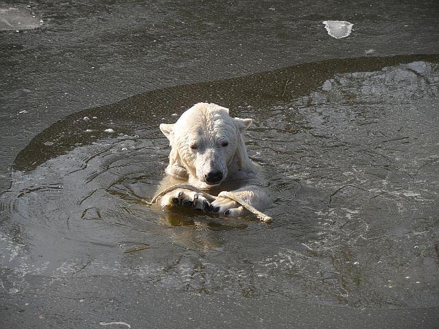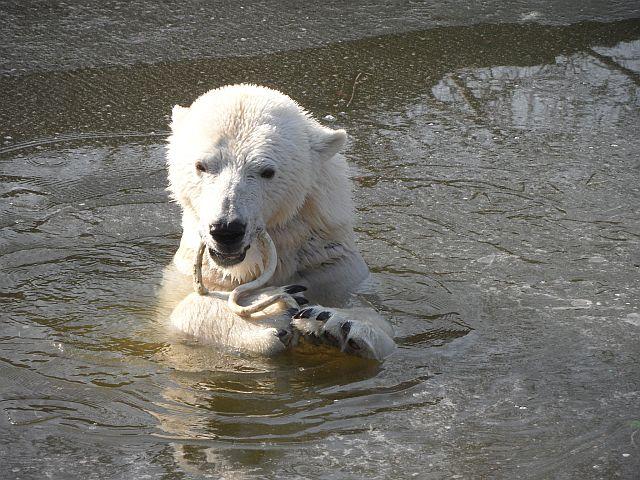 Aber das wichtigste ist Knut. In den zwei Stunden am Nachmittag hat er die Anlage für sich alleine. Er schnüffelt alles ab. Meistens vergnügt er sich im Wasser, spielt mit allem was er finden kann und betrachtet die Besucher. Sehr schade, daß ihm heute die Möglichkeit genommen wurde.