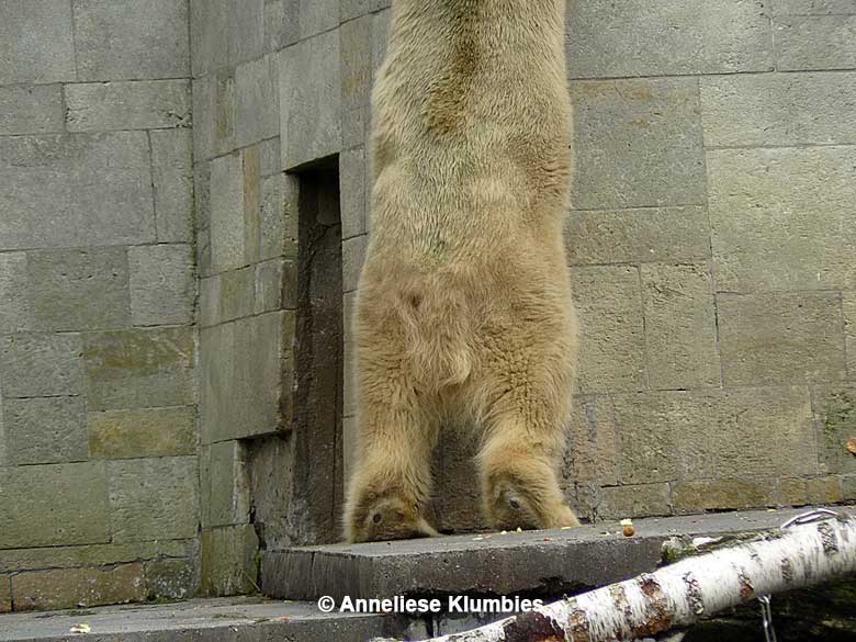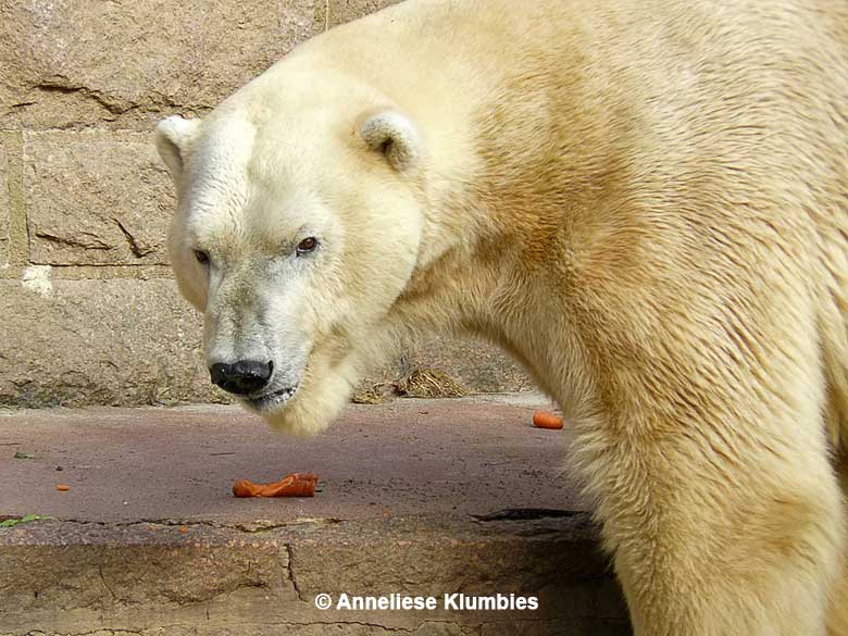 Ich fragte die Tierpflegerin, ob man die Tiere streicheln könne. Nein, das wäre nur bei den beiden verstorbenen Eisbärinnen möglich gewesen, und auch nur, weil diese sehr alt gewesen seien. Und was würde passieren, wenn man eine Hand durchs Gitter stecken würde? Die wäre weg, was nicht notwendigerweise als aggressiver Akt zu verstehen sei, sondern als ein Reflex. Die Hebelwirkung des Gebisses sei so kraftvoll, dass man schon ein Knut sein müsse, um diese auszusetzen.