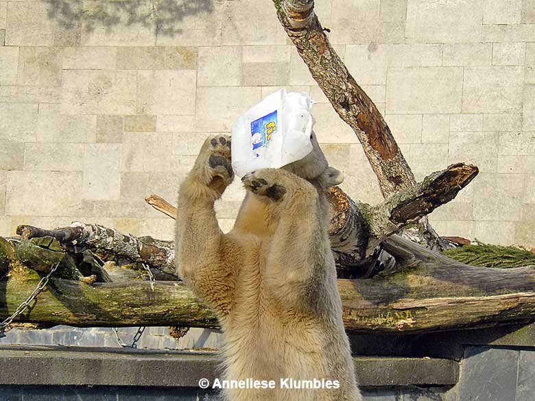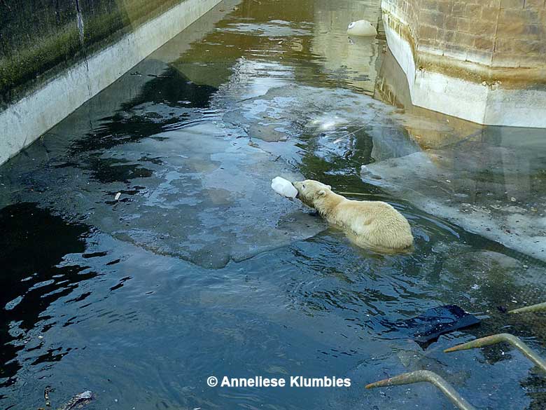 Es waren noch Eisschollen auf dem Wasser und sie hatte wohl Befürchtungen, sich zu stoßen. Wahrscheinlich weiß sie entgegen den Annahmen der Tierpfleger sehr wohl, welche Konsistenz Eis hat und welche Gefahren damit verbunden sind. Vienna war's recht; sie holte sich auch den zweiten Kanister inklusive Hering.