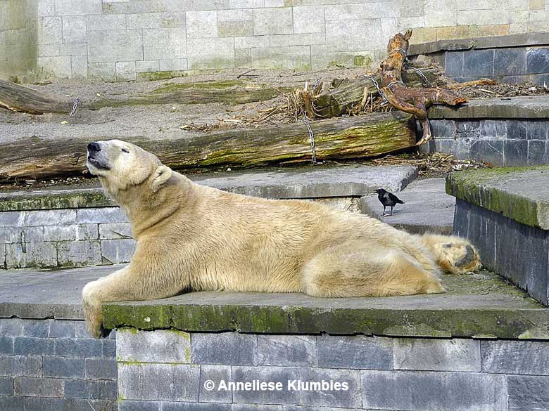 Am 13. März war Eisbärenwetter und das Wasser im Graben noch gefroren. Die beiden Kodiakbären hielten sich zwecks Winterschlummer im Inneren des Geheges auf. Beim zweiten Besuch konnte ich einen der Kodiakbären erblicken, der verschlafen und dekorativ in die Sonne blinzelte.