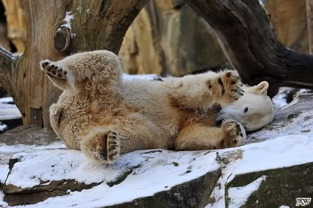 Dann wurde gebalgt und auf Eisbärenart geschmust. Aber nicht zu lange. Dann ging Knut zu seiner Kuhle und aalte sich dort lange und genüsslich im Schnee.