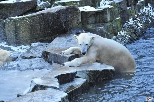 Dafür war bei Knut und Gianna etwas los. Zum einen waren schon etliche Besucher da, sowohl Stammbesucher als auch Touristen. Zum anderen waren die beiden jungen Bären sehr gut in Form. Als ich ankam, war Knut gerade im Wasser. Gianna wanderte auf der Anlage herum, kletterte die Felsen hinauf und hinunter. Die Steine waren ja ziemlich vereist und so hatte Gianna zu tun, aber sie schaffte es. Kein Wunder bei ihren Pelzsohlen.