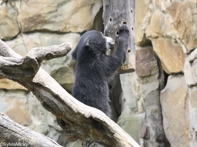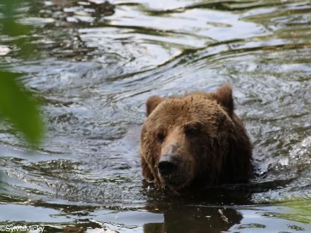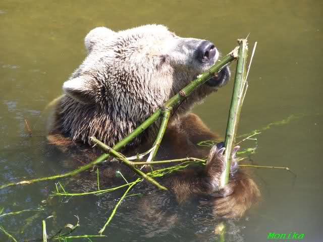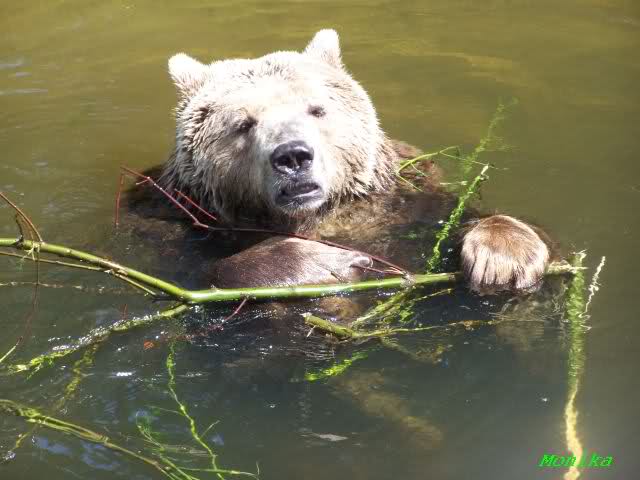 Einer der Braunbären genoss heute das Bad im Wasser mit einem Zweig.