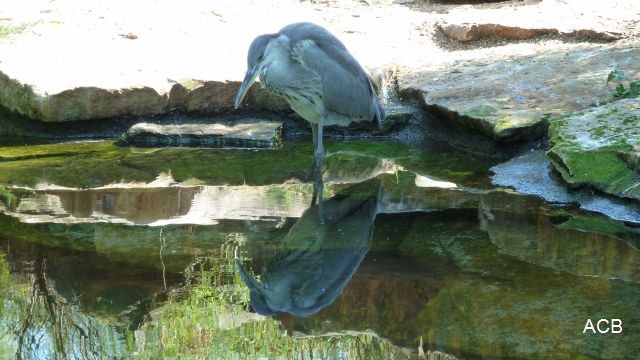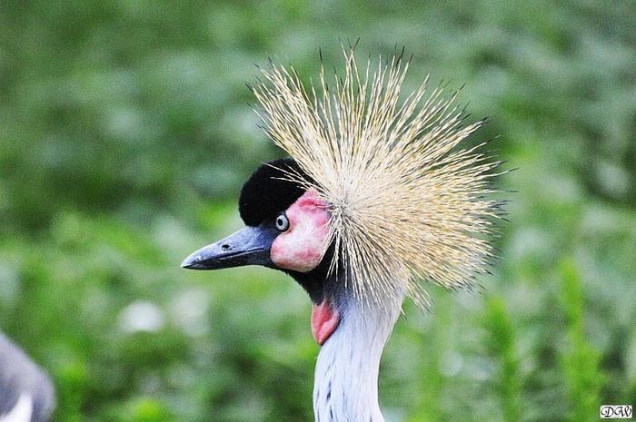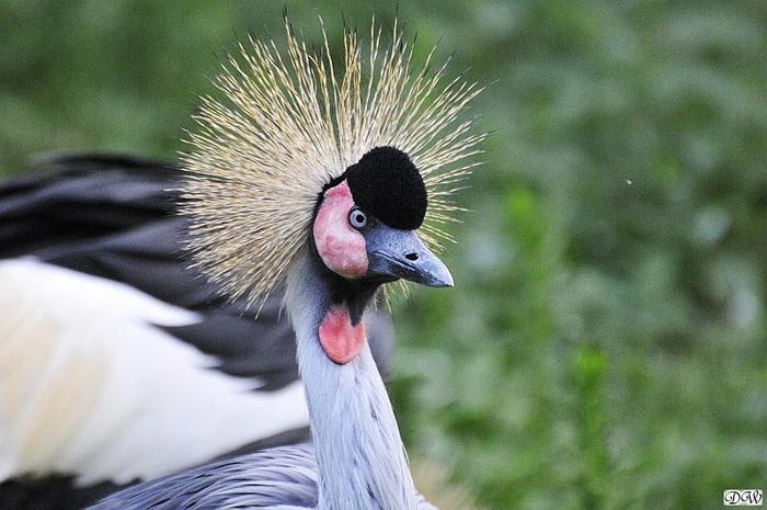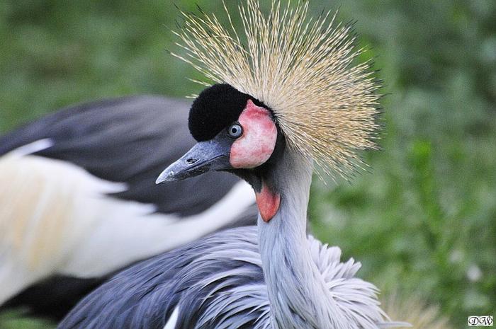 Der Kronenkranich fühlte sich durch einen Reiher gestört und beäugte ihn eingehend