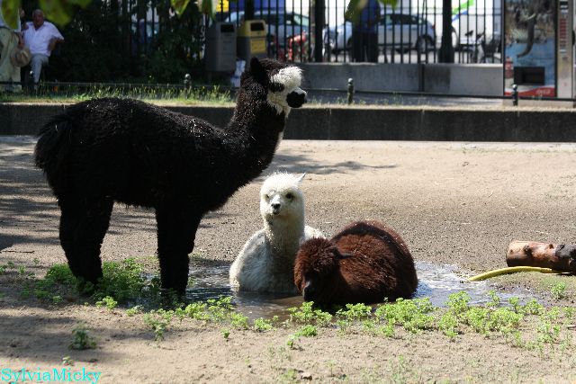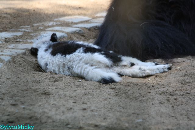 Auf der Anlage der Alpaka war auch ein Rasensprenger. Als der abgestellt wurde, legten sich die Tiere in eine Mulde, wo sich Wasser gesammelt hat.