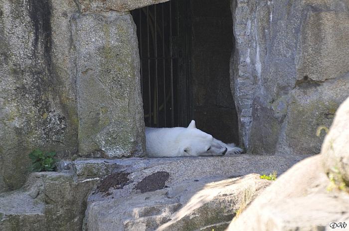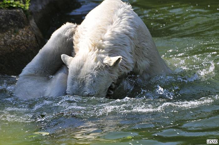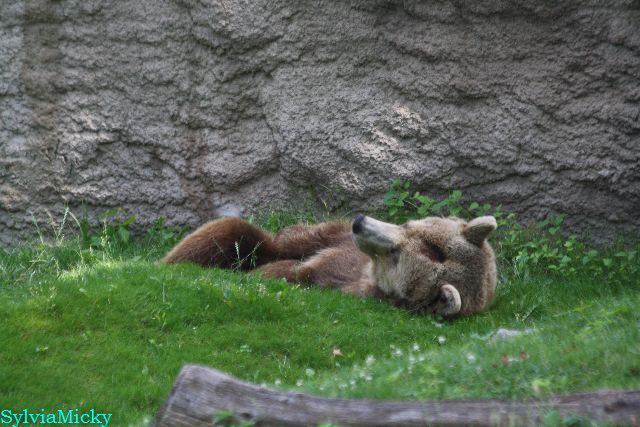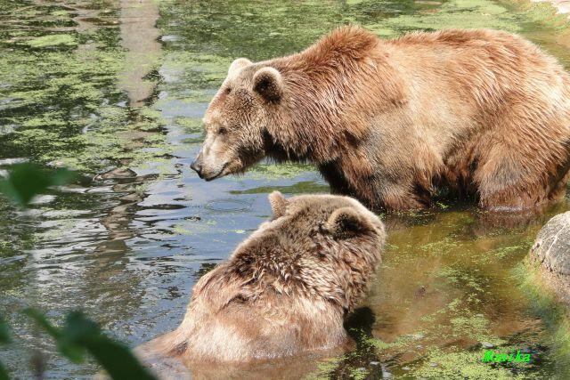 Katjuscha steht auf. Kommt sie ins Wasser wie fast jeden Tag? Meistens kommt sie ins Wasser wenn eine der anderen Bärinnen aufgibt. Aber man kann sie auch alle drei im Wasser toben sehen. Ich konnte nicht warten – es war zu heiß!