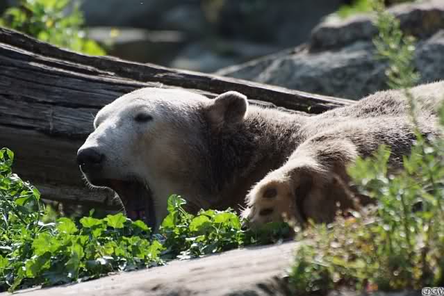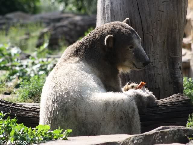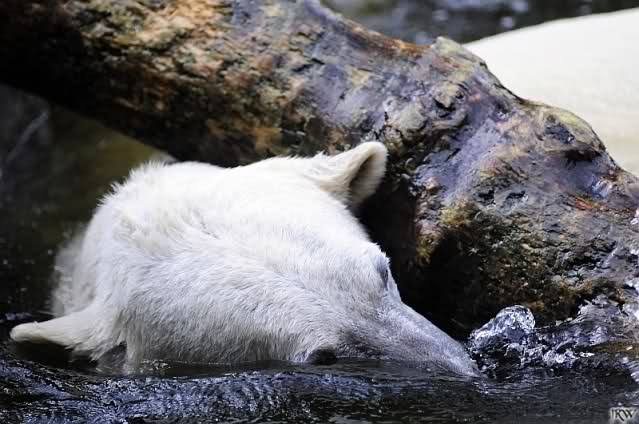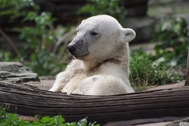 Als ich heute Nachmittag in den Zoo ging tobte Knut wieder mal mit dem Baumstamm im Wasser. Er schmiß ihn mit den Zähnen durchs Wasser, sprang vom Teich auf ihn und wirbelte ihn durch den Wassergraben. Danach wurde ab und zu geruht und die Anlage nach Eßbarem abgesucht. Nach dem Abendbrot wurde wieder weiter mit dem Baumstamm getobt.