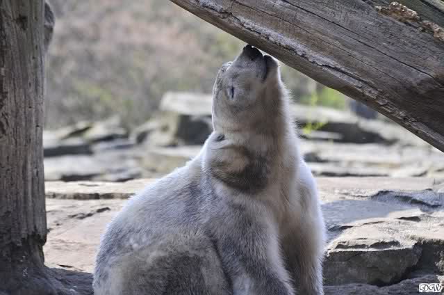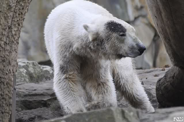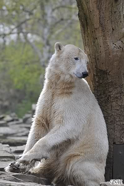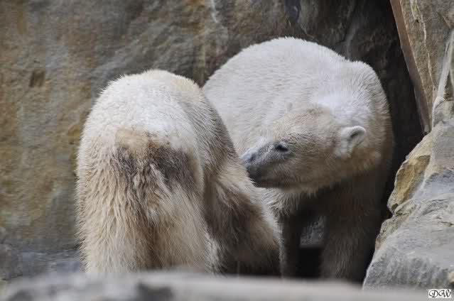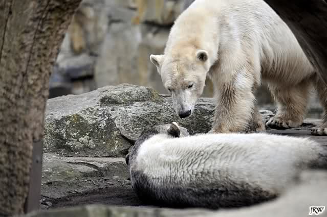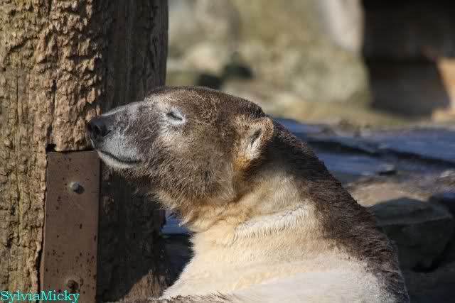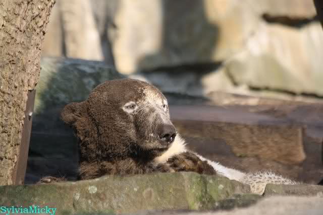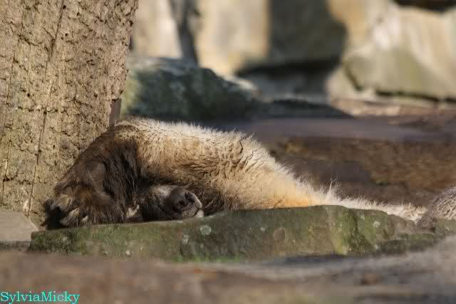 Über Knut und Gianna gibt es heute Vormittag nicht viel zu berichten. Knut lag unter dem Baum und färbte sich ein. Als Gianna den Platz beanspruchte legte er sich neben den Metallbaum und schlief. Da lag er noch, als ich gegen 13.00 den Zoo verließ.