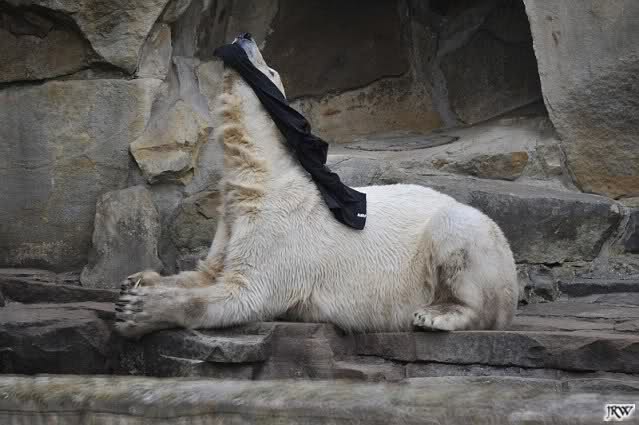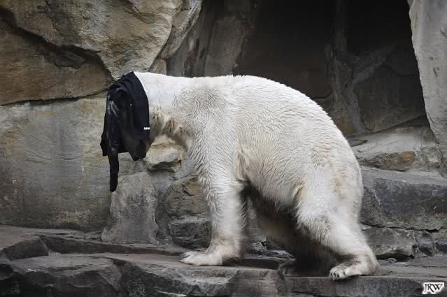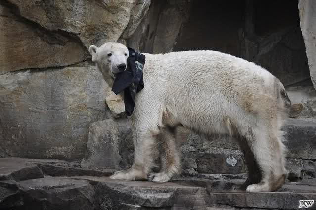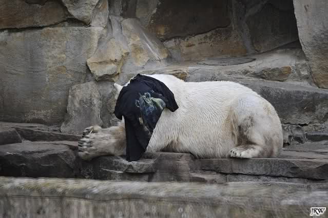 Nach der Abendfütterung kam Knut wieder heraus und brachte etwas mit. Ein Nashorn-T-Shirt!! Wie so oft, spielte er ruhig und zufrieden vor sich hin und sah hinreißend aus dabei.