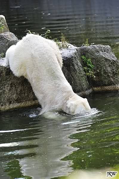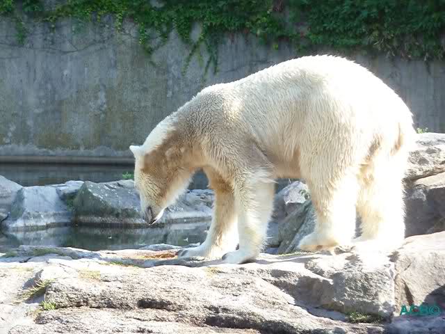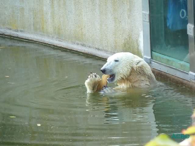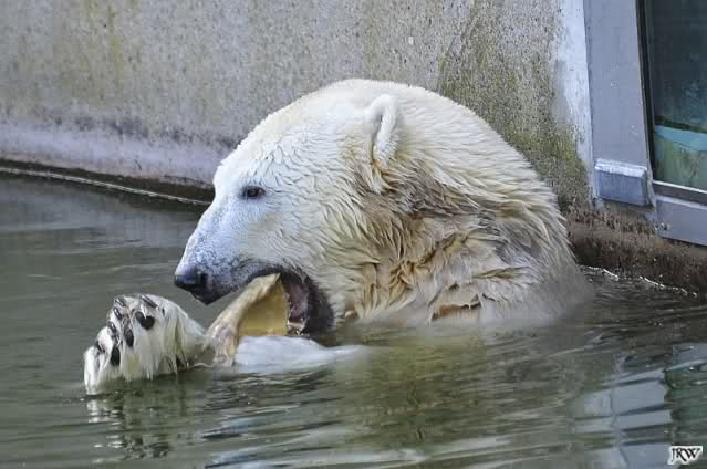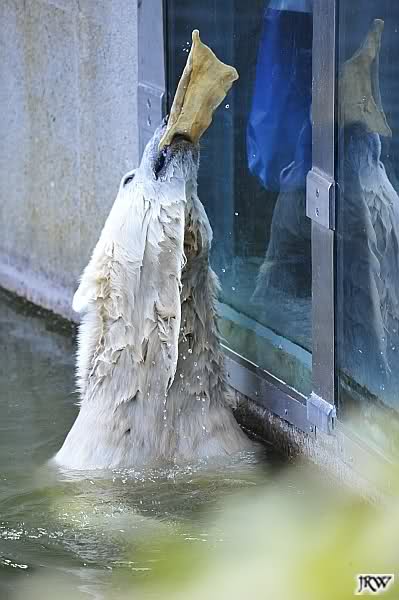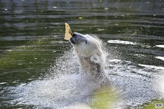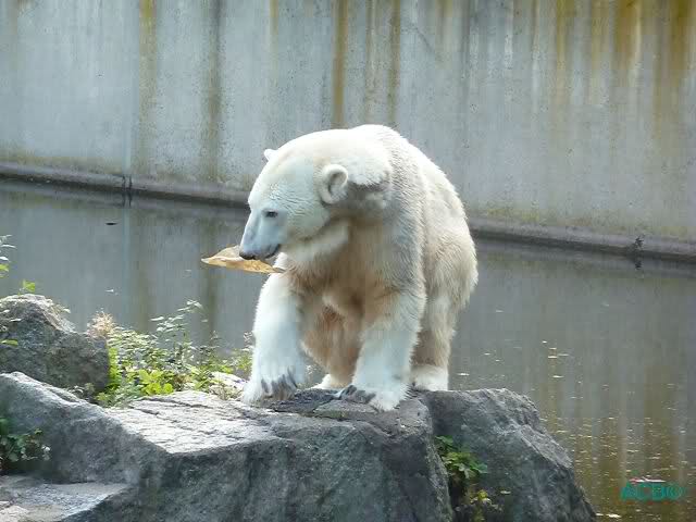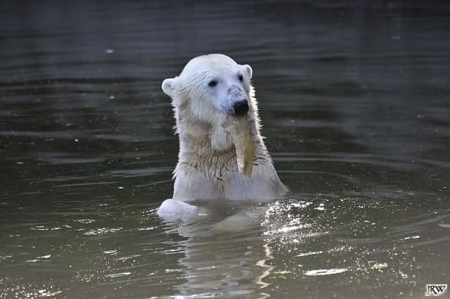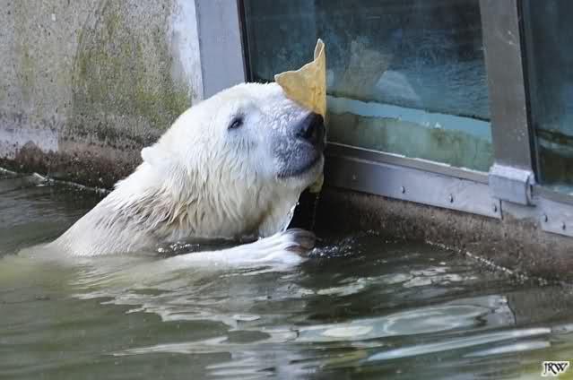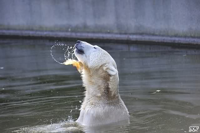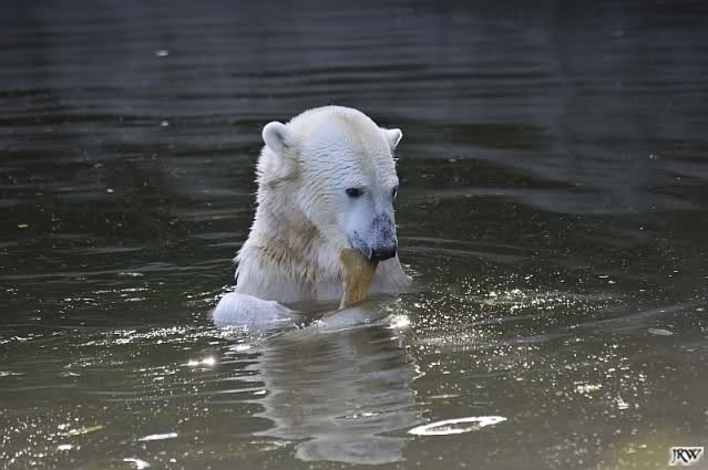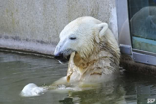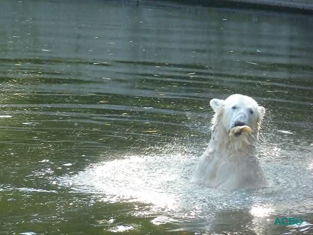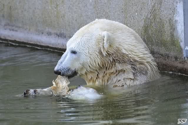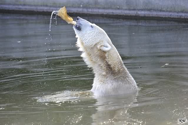 Als Frl. Weckert mit dem Futter kam, stand Knut vorne, aber als Tosca dann ins Wasser hechtete, lief Knut gleich weg. Fr. Weckert rief Knut, aber der war erstmal nicht zu sehen. Derweil tauchte Tosca mit einem Fisch und ein Stück Fleisch in der Schnauze auf. Da das meiste Futter im Wasser landete, ging Knut heute ziemlich leer aus. Er fraß einen Fisch und 2 Stückchen Fleisch. Während Tosca sich heute bestimmt wie im Schlaraffenland vorkam, holte sich Knut nach und nach die Brötchen, die auf der Anlage lagen. Tosca tauchte immer wieder ab und holte ein Fisch nach dem anderen heraus. Es waren auch noch einige Stücke Fleisch dabei.