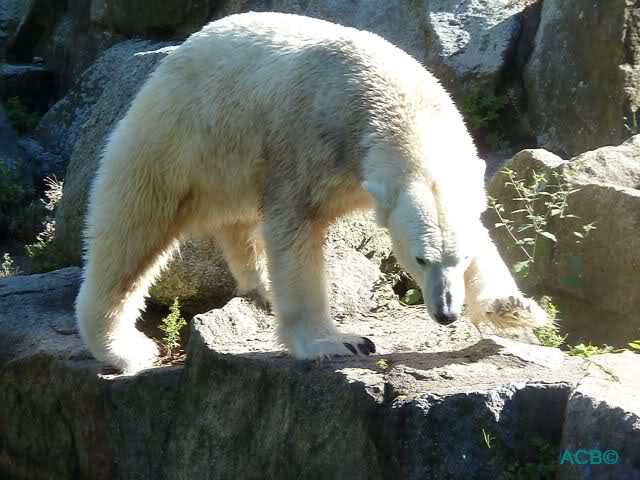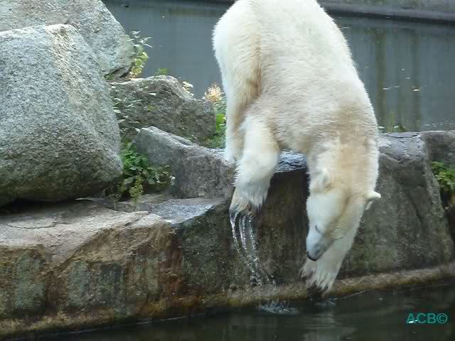 Es ist nicht zu fassen, was Menschen anstellen, wenn sie wollen, dass ein Eisbär zu ihnen herschaut. “Knuti, Knuti”, ruft eine ältere Dame – so, als ob das Raubtier ihr Kind wäre. Andere führen eine Art Fruchtbarkeitstanz auf, um Knut zu einem kurzen Aufblicken zu bewegen. Doch der denkt nicht daran, liegt mit dem Rücken zum Publikum auf einem Felsen und lässt lediglich seine Tatze locker hin und her schaukeln.