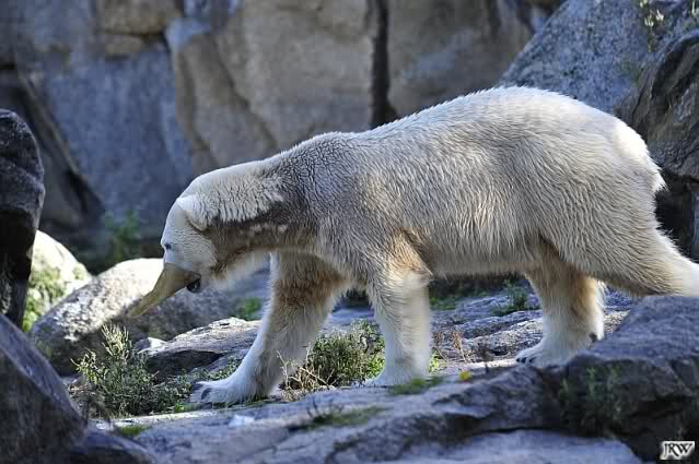 Heute Morgen lag Knut vorne auf dem Felsvorsprung und Tosca lief ihren Gang, zwei Schritte vor und zwei zurück. Nach kurzer Zeit startete sie den ersten Annäherungsversuch, wurde aber gleich wieder angebrummt. Tosca lief heute langsam zu Knut; hatte aber auch keinen Erfolg. Das wiederholte sie einige Male.