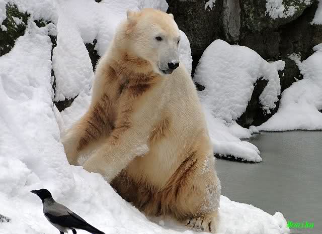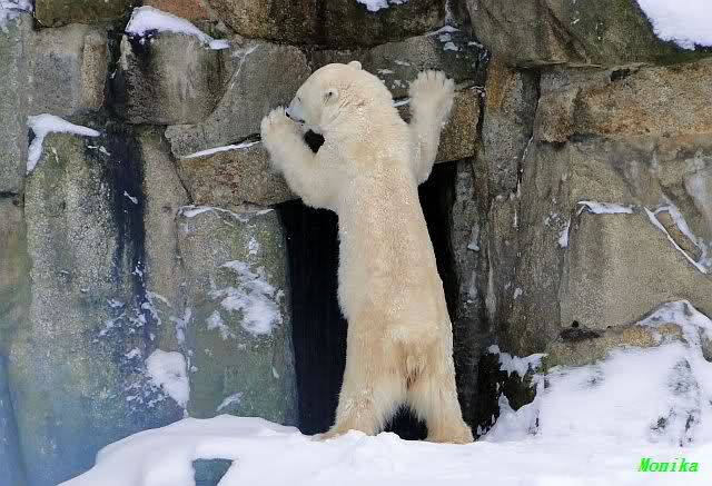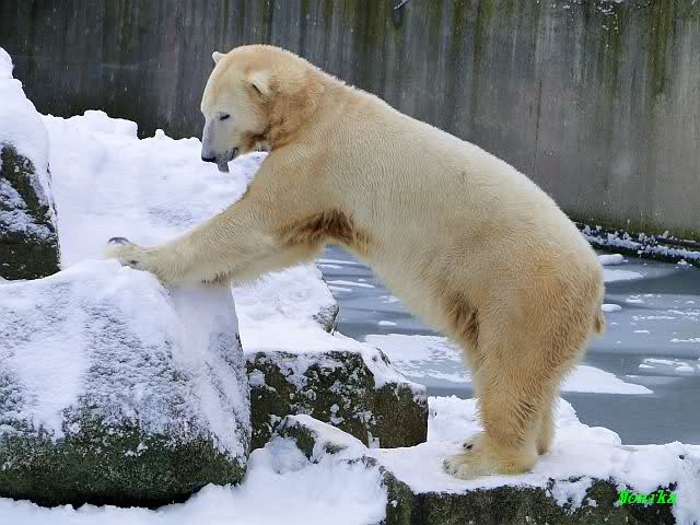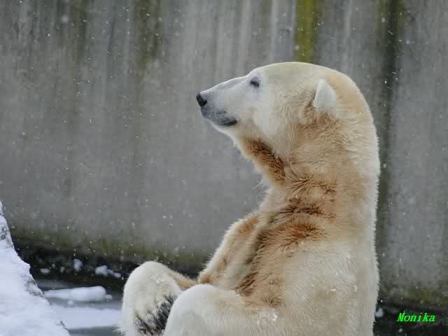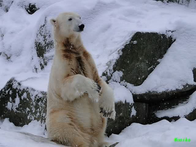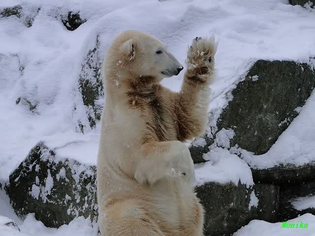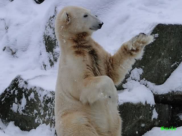 Heute Morgen war ich zuerst ganz alleine am Bärengehege. Knut schaute mal kurz hoch, und das war`s. Einige Zeit später stellte er sich auf und schaute um sich. Dann kam Spreewaldmarion um die Ecke. Sie begrüßte Knut und winkte ihm zu. Was macht Knut? Er winkte zurück. Nicht nur einmal, nein gleich zwei bis dreimal. Was hat sie, was ich nicht hab?