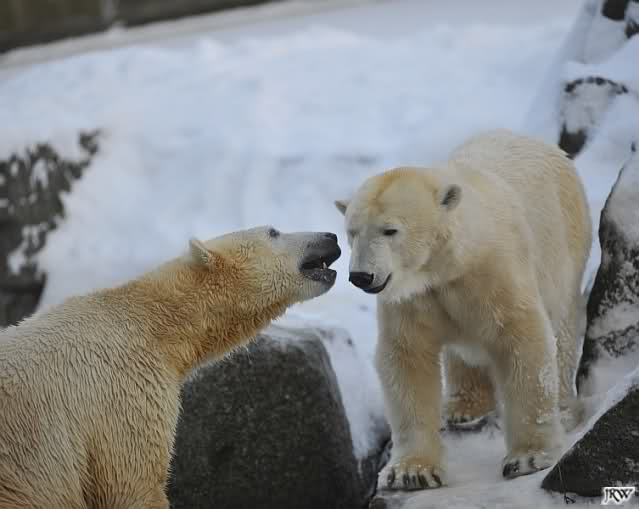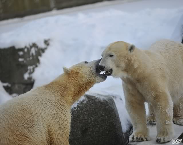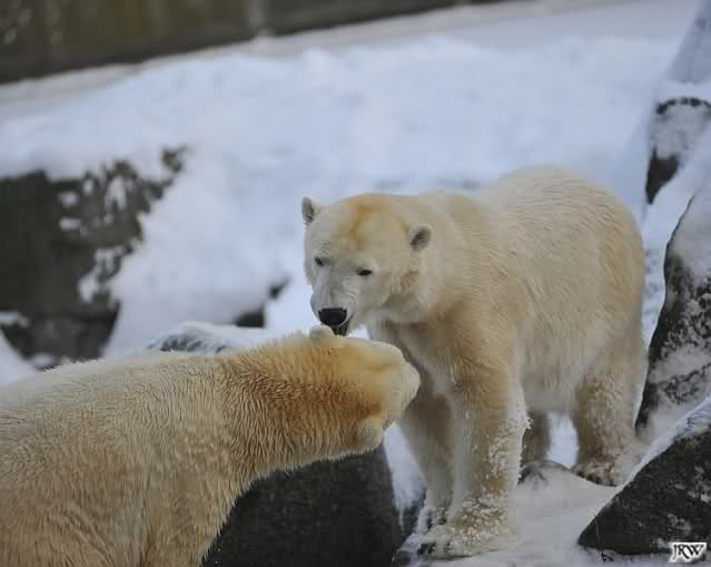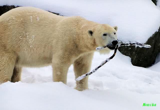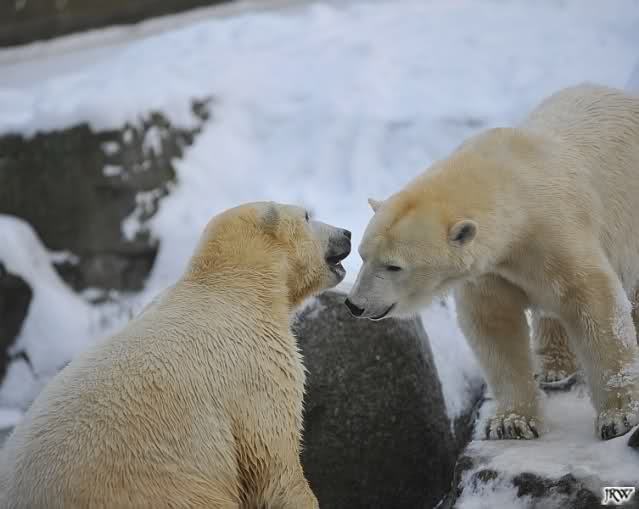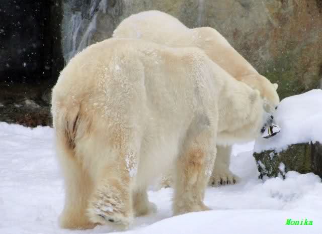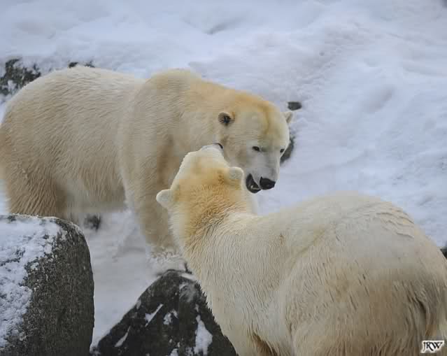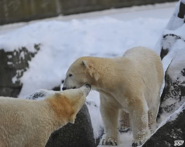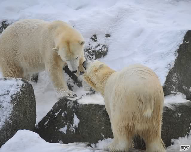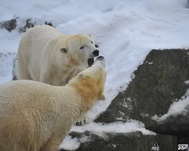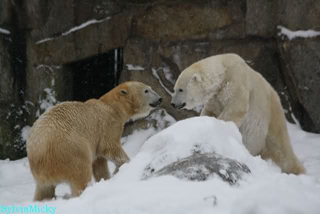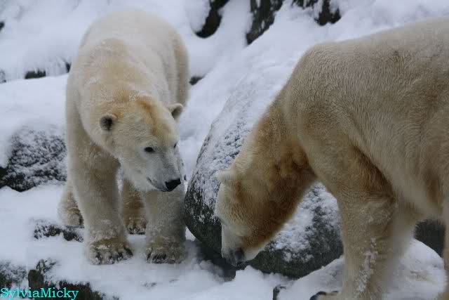 Für ein Weilchen war allgemeines Ruhen angesagt (ich meine nicht die Bärenfreunde sondern natürlich die Bären). Nachdem Monika schweren Herzens gegangen war, weil sie zu sehr schwitzte (ja, Ihr habt richtig gelesen), wurde es sooo schön. Tosca kam zu Knut und für lange Zeit spielten die Beiden miteinander. Der Schnauzenkontakt wollte garnicht aufhören. Wenn Tosca aufstand um fortzugehen, machte Knut Schritte auf sie zu. Wollte Knut gehen, streckte sich Tosca zu ihm und alles fing von vorn an. Hinterher bemerkte jemand, dass Tosca Knut nur bezirzt hat, damit sie an seinen auf dem Eis liegenden Stock herankam. Selbstverständlich nicht!! Sie fand ihn nach dem gemeinsamen Spiel nur interessant. Außerdem tat sie Knut einen Gefallen. Er hatte lange versucht den Stock zu bekommen, aber traute sich nicht auf das Eis. Tosca schwamm einfach hin und angelte den Stock, schob ihn unter die Eisdecke und holte ihn auch wieder hervor.